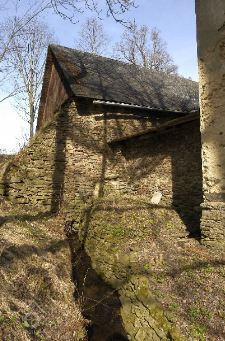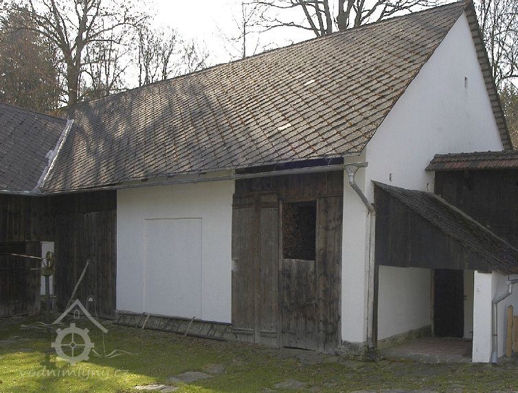 Drobný patrový objekt na takřka čtvercovém půdorysu, vložený mezi mlýnici a stodolu na jižní straně dvora. Na dvorní straně nízká přízemní část zděná omítaná, na ni nasedá bedněné patro; jižní průčelí obrácené k odpadnímu kanálu je vyzděné z kamene bez omítek. Střecha pultová spádovaná k jihu, nad dvorním průčelím pouze dvě řady tašek nad sebou. Dvorní průčelí trojosé - vpravo dvojice nízkých obdélných vstupů v kamenném ostění, dvířka dřevěná svlaková; vlevo vyšší obdélný vstup, chráněný kolmo vybíhající předsíňkou s pultovou střechou.