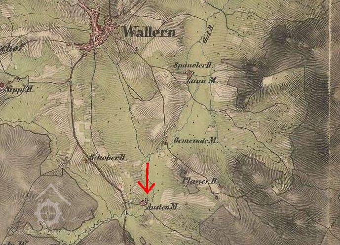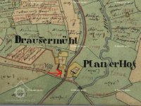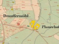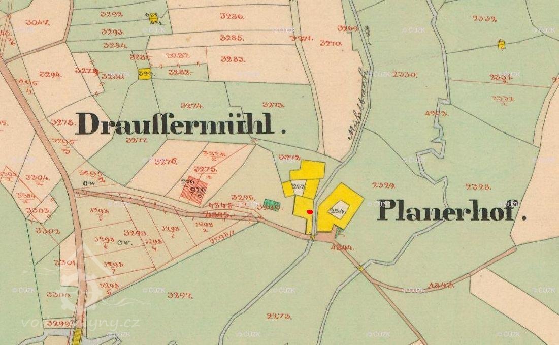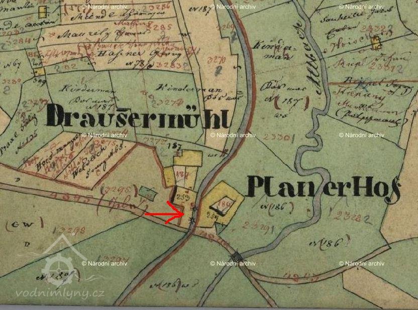 Objekt mlýna i sousedního Planerova dvora je zobrazen na mapě Stabilního katastru :Čechy: 8752-1-Volary,mapový list č.025.Mlýn měl číslo popisné 187/st.p.253.Jeho původní název,uváděný v Pozemkové knize je "Drauster oder vormals Magdalena Stögbauersche Fundations Mühle NC.187 in Wallern".K mlýnu majetkově patřily ještě další stavby na st.p.398,633,391 a 636.Stručně k vlastnictví:
