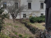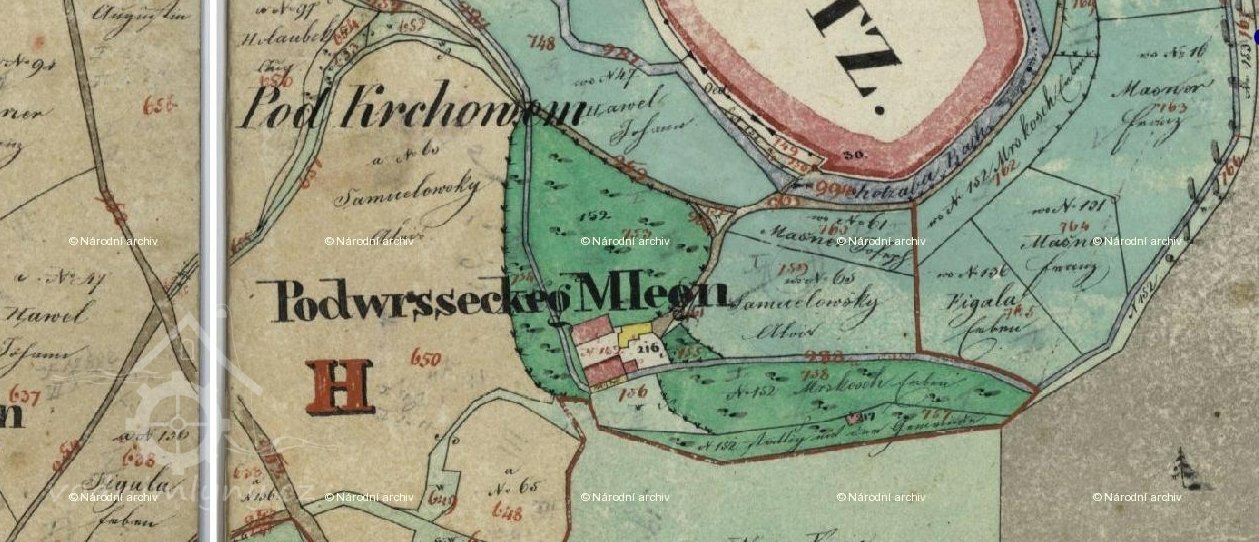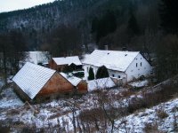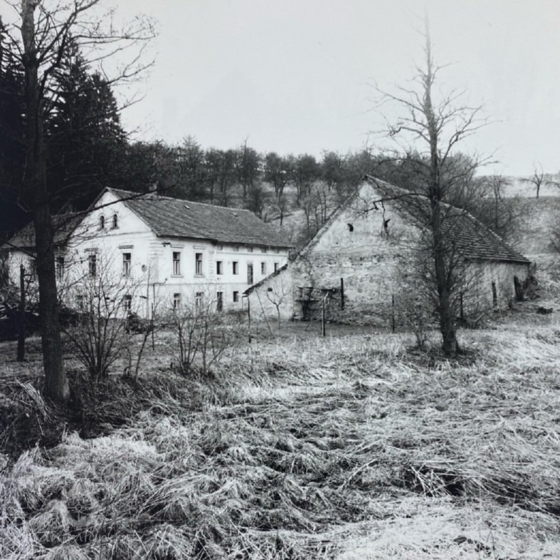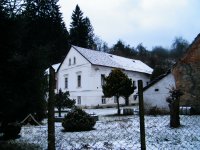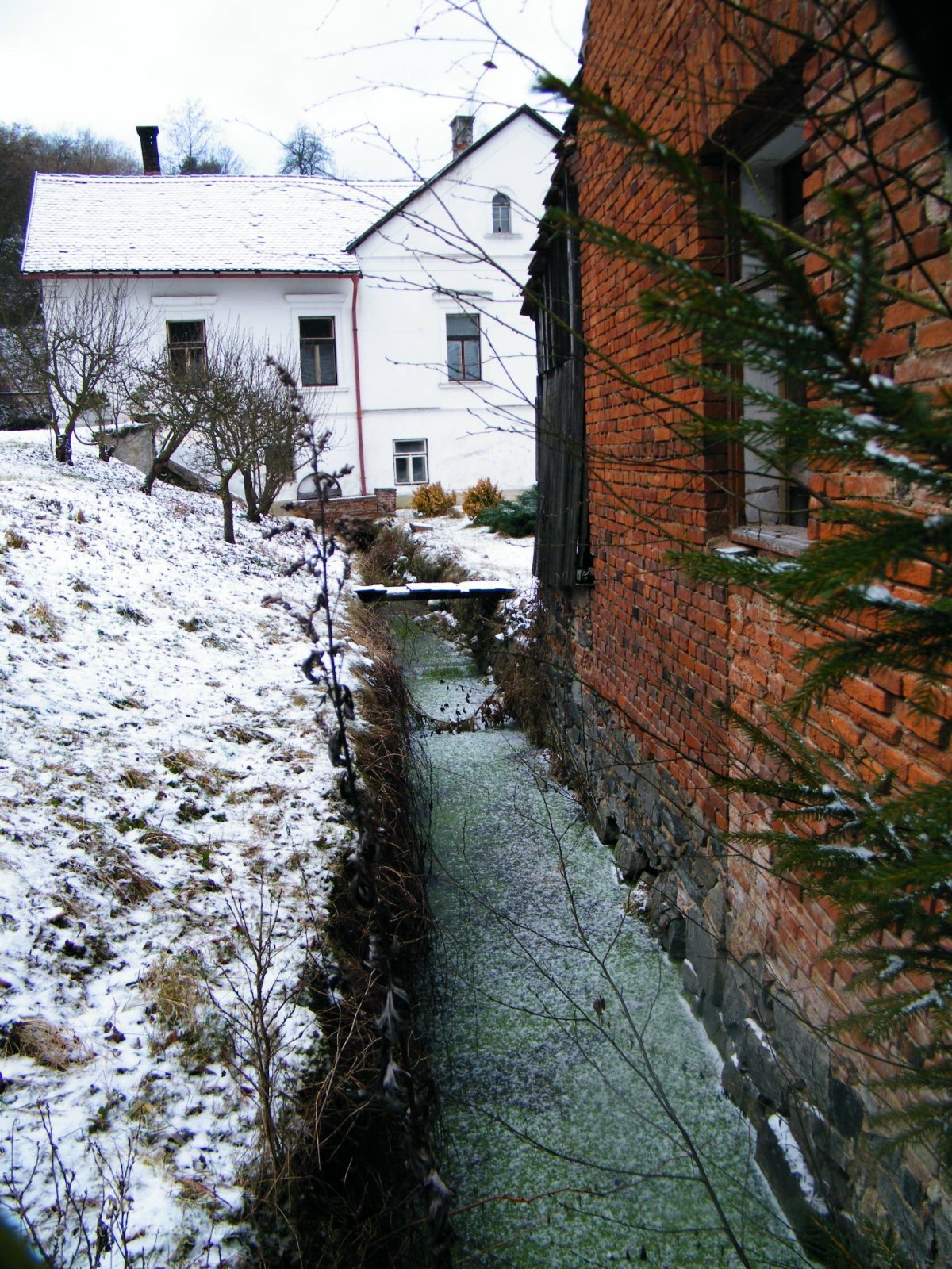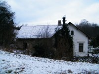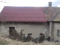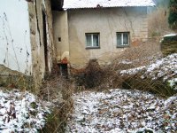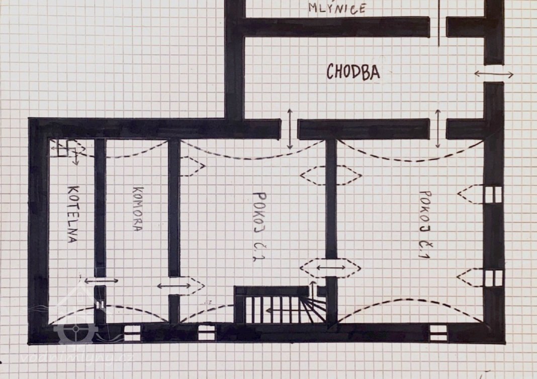 Druhý – zadní otvor napravo z chodby vede do místnosti, která je na většině povrchů stále omítnuta bílou barvou přecházející do tělové. Klenba, počet výsečí i stav podlahy jsou obdobné jako v předním prostoru. Tato místnost, ve které mohla býti v minulosti černá kuchyně, je průchozí otvorem zpět do přední místnosti. Vedle ní se nachází dřevěné rámové dveře vedoucí do prvního patra rozpadlým a tedy i nefunkčním schodištěm. Jednoramenné pravotočivé schodiště je v základech zděné, podstupnice a stupnice – respektive nášlapná deska, jsou tvořeny fošnami natřenými červenou barvou. V místnosti se dále nachází špaletové okno, umyvadlo a nika, situováná vedle dveřního otvoru do chodby. Díky dochovanému plánu na přístavbu prádelny a šalandy jako samostatného celku mimo budovu, který se pravděpodobně neuskutečnil, můžeme předpokládat, že tyto dvě popsané místnosti se nakonec nacházely v přízemí obytné části a byly uzpůsobeny tak, aby plnily požadovaný účel.