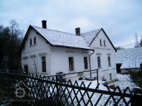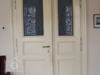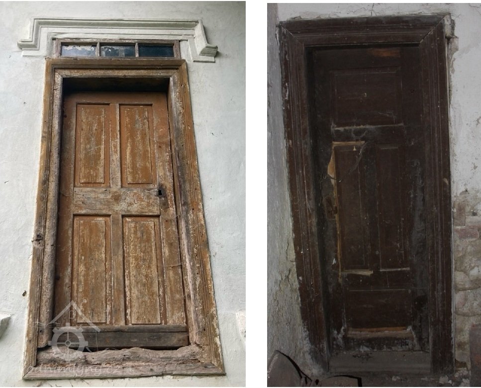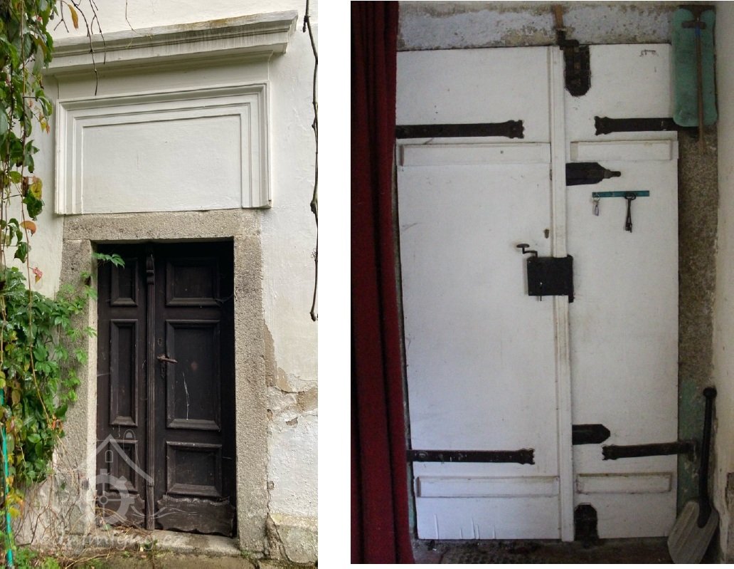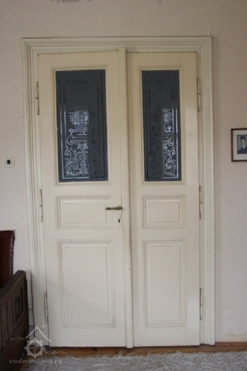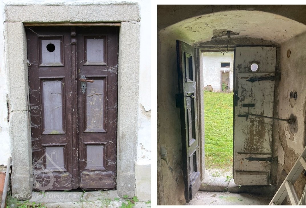 Prostor obytné části v prvním patře je přístupný hlavním vchodem z jižního průčelí. Vstup je vyplněn základní svlakovou konstrukcí dvoukřídlých dveří s kombinací rámové konstrukce na lícové straně – tedy z exteriéru. Lícová strana dveří hnědé barvy je členěna do šesti rámových polí, na které jsou ve spodní části dveří přibitá dvě zdobně řezaná prkna. Klika z exteriéru je mosazná s odděleným klíčovým štítkem. Z rubové strany jsou dveře bílé, svlakové konstrukce s vodorovnými svlaky a závěsy, které se na konci štěpí do tří obloučků. Dveře mají zevnitř čtyři petlice a kovanou „talířkovou“ kliku s krabicovým zámkem.