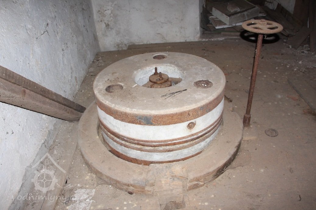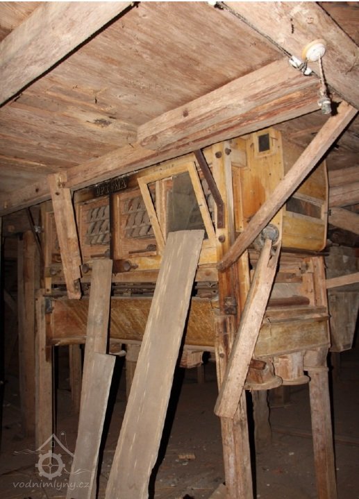 Do prvního patra se leze po žebříkových schodech s trámovými schodnicemi, deskovými stupni pokrytými lištovaným bedněním. Stropní pohledová konstrukce je tvořena trámový stropem se záklopem. Podlaha je dřevěná tvořena z fošen. Na severní straně se nacházejí tři okna, pod kterými je stěna obložena vodorovnými prkny končícími v úrovni dřevěného parapetu oken. V patře se vyskytují troje dveře. První – na severní straně jsou nahoře zakončené lehkým segmentem, pod kterým je situován světlík. Dveře jsou jednokřídlé, rámové konstrukce členěné do čtyř rámových polí s vertikálními esovitými závěsy z rubové strany. Ve spodní části pobité vodorovným prknem. V oblasti kliky se nacházejí stopy po krabicovém zámku a zarážku tvoří pouze oko, kterým je prostrčen kus ulomené kliky. Druhé dveře na západní straně jsou zvenčí zazděné, tudíž na západním průčelí nejsou viditelné. Dveře jsou jednokřídlé, rámové konstrukce členěné do čtyř polí. Jelikož je zazděná rubová strana, nelze určit závěsy. Třetí dveře vedoucí na jižní stranu k náhonu jsou dvoukřídlé, svlakové konstrukce se zašpičatělými závěsy. Z horních k dolním svlakům obou křídel rubové strany dveří vede vzpěrná diagonála, tvořící na levém křídle pomyslné písmeno Z a na pravém křídle zrcadlově převrácené písmeno Z. Dveře jsou bez kliky pouze s krabicovým zámkem a dvěma petlicemi. Přes šířku dveří je protažen menší dřevěný trám zabraňující průchodu. Na lícové straně je provedeno členění do šesti rámových polí. V prostoru patra ze stropu trčí dolní část kapsového výtahu pro druhé patro, dva koše od válcové stolice a tři železné roury, buď k odvádění vzduchu z horního patra či pro přepravu sypkého materiálu. Na zemi kapsový dopravník pokračující z přízemí a mlecí kámen.