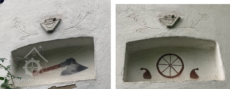 Hůře přístupné západní průčelí je natřeno bílou barvou s absencí viditelného soklu. V přízemí se nachází dvě obdélné niky výškové orientace, rozměru dveřního otvoru, zaklenuté mělkým segmentem. V patře se nacházejí tři menší obdélné niky šířkově orientované, taktéž se zaklenutým mělkým segmentem. Uvnitř první a třetí niky je hnědou linkou namalován decentní obrázek mlýnského kola uprostřed, vedle něj figuruje z obou stran motiv plaménku (možné znázornění plynosacího motoru). V prostřední nice je namalován motiv sekery s širokou čepelí. Nad těmito třemi nikami se nachází dekorační plastický prvek, od kterého z obou stran vedou do zdi vyryté růže. V podkroví se objevují dvě okenní osy půlkruhově zakončené a vyplněné mříží, nad kterými jsou situovány dvě menší kruhová zavětrávací okénka s dekorovanou mřížkou. Na západním štítě kopíruje střechu hladký vystupující pás. U zdi průčelí je opřen setrvačník.