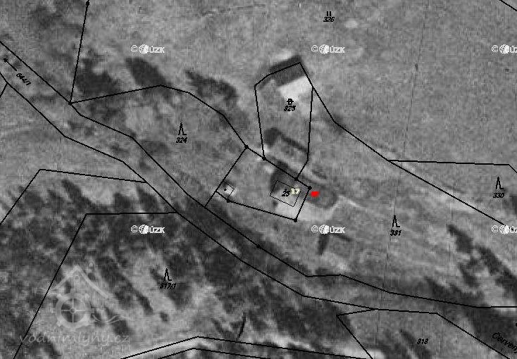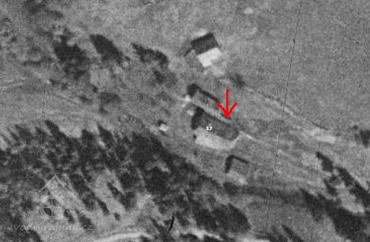 Na leteckém snímku z r. 1949 budova mlýna ještě stojí. Později zchátrala byla zbourána.