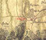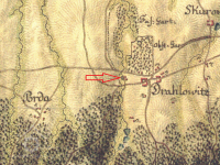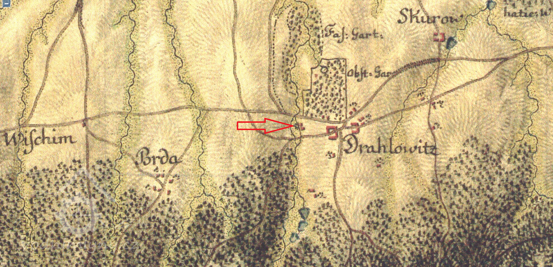Mlýn u panského dvora v Drahlovicích na potoce přitékajícím z Brdských Hřebenů, zachyceny pouze na mapě I. vojenského mapování.
