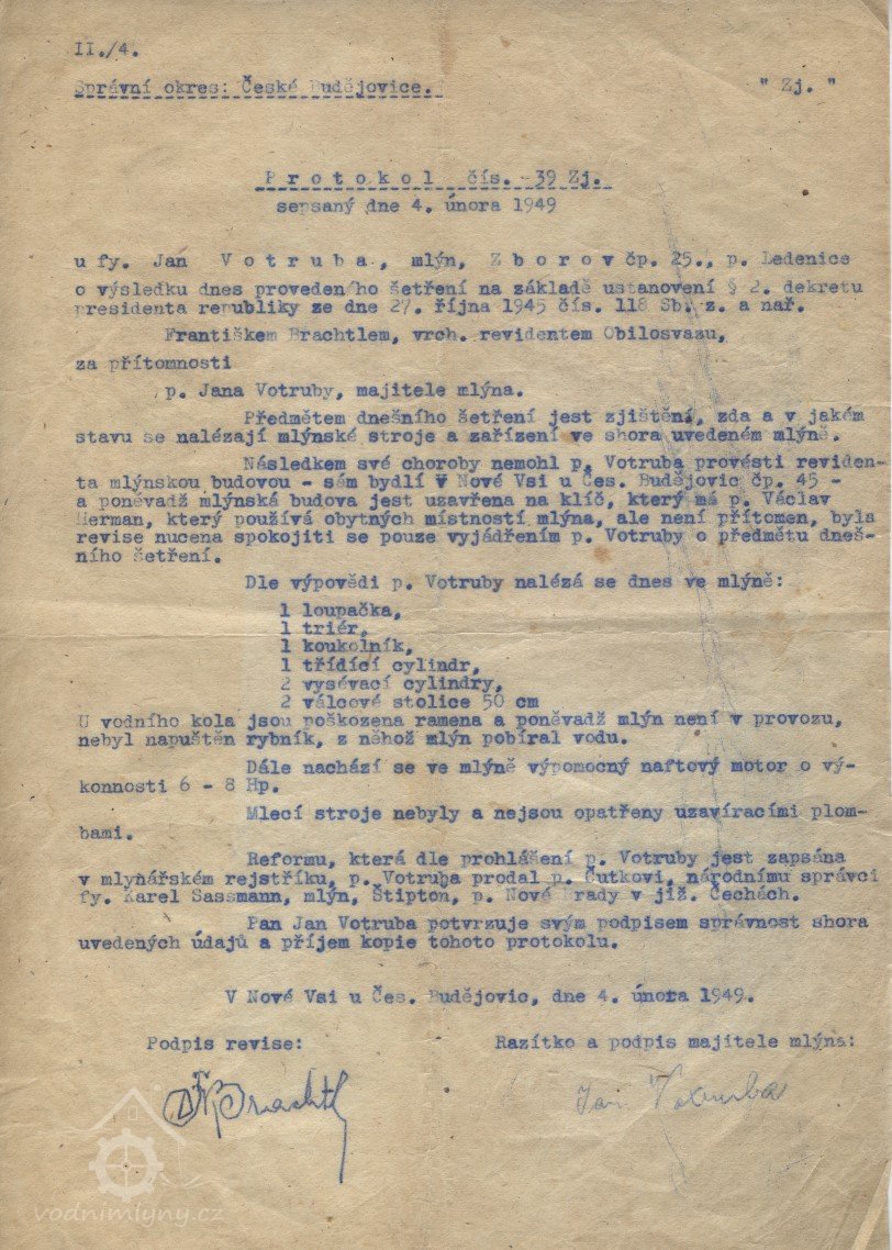 Soupis vybavení mlýna po jeho zastavení koncem čtyřicátých let, kdy děda už nemohl ze zdravotních důvodů vykonávat svou profesi. Mlýn pak měl v pachtu jistý Herman, který zkázu mlýna dokonal...