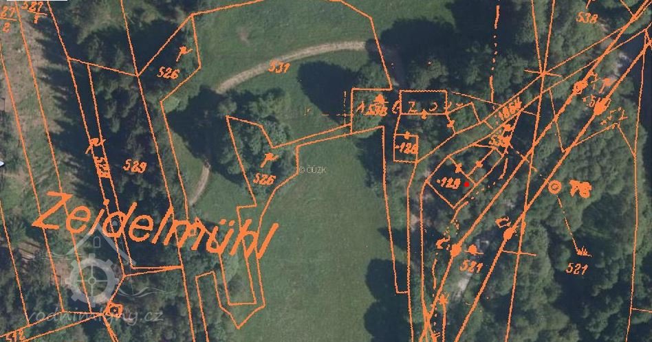 Mlýn nestával bezprostředně pod hrází rybníka, ale o 150 m níže při silnici do Dlouhého Újezdu. Zanikl po 2. světové válce. Dobře zachován náhon, zejména část bezprostředně pod východním koncem hráze rybníka, vytesaná do skalního bloku.