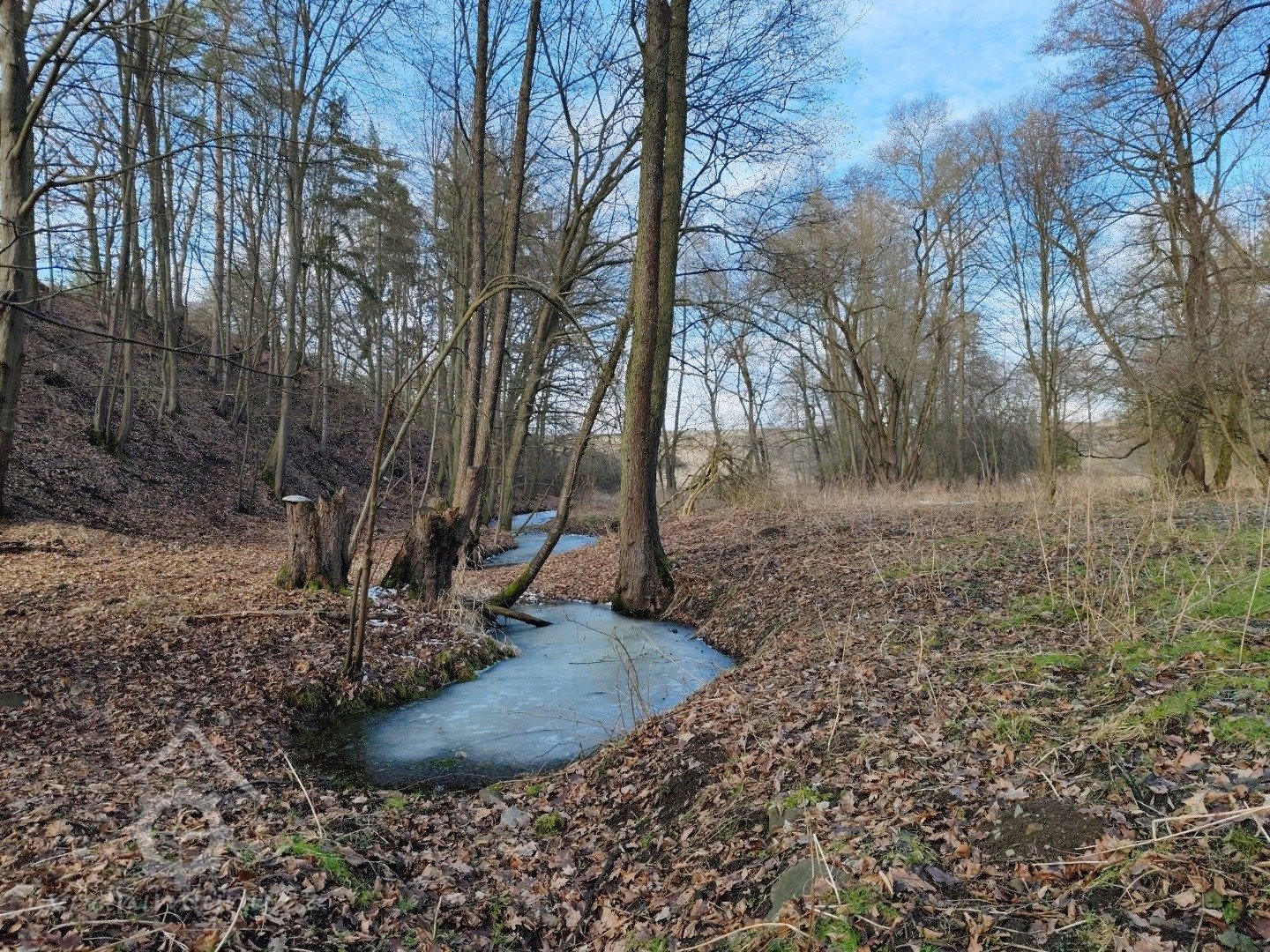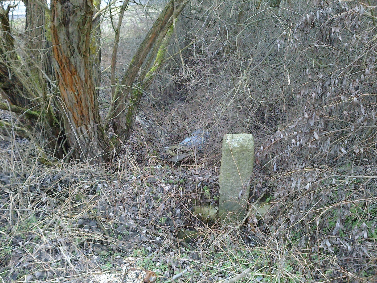 V místě od prodlouženého zájezku po potoce 4,4mt vzdáleného vztýčená na prodloužený směr tento kolmice 4,5mtr dlouhá, v jejíž koncovém bodu vykopaná 1,2mtr hluboká jáma, na jejíž spodek vložena kamenná plotna a na tuto postaven dřevěný 0,20 do čtverce silný a 0,80mtr dlouhý kůl, kterýž spodem dvěma kříž tvořícími rameny opatřen jest.