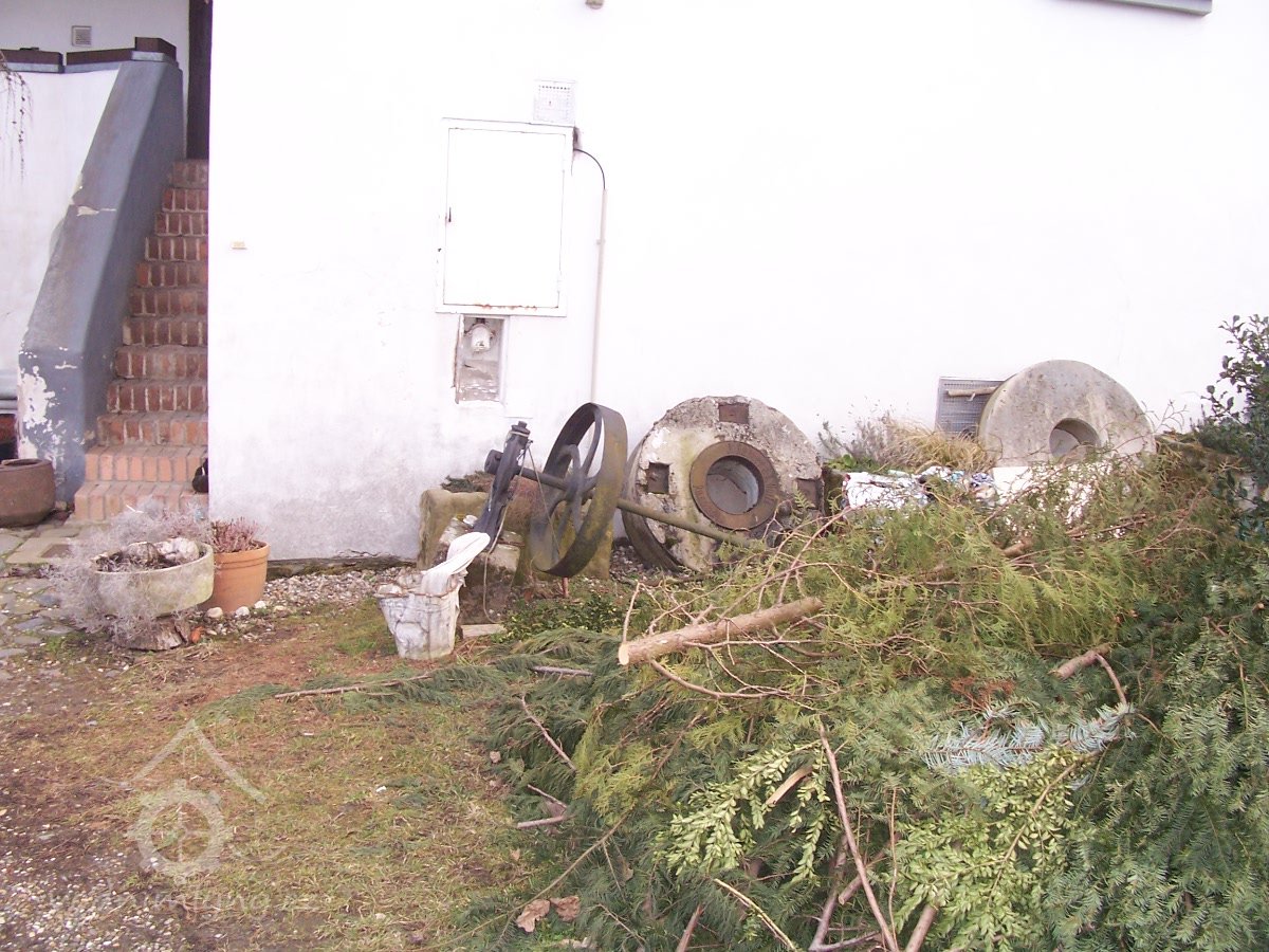 Na zahradě uloženy 3 mlecí kameny a část transmise jako dekorace.