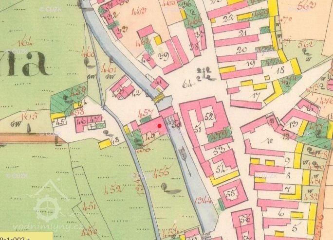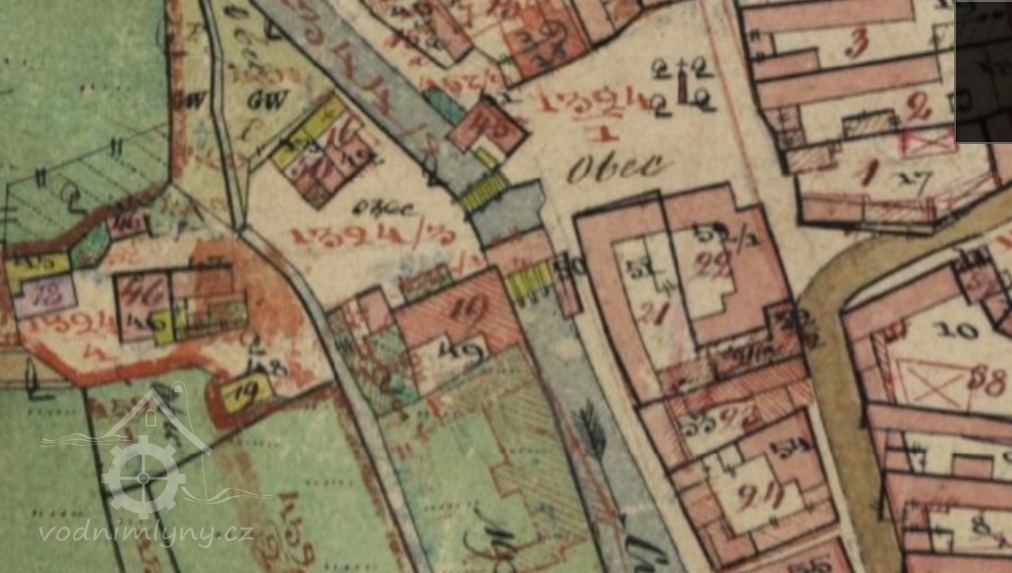 Popispřed přestavbou 1891: 1 vodní kolo na spodní vodu, prům. 5,5 m, šířka 2 m