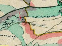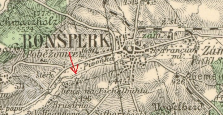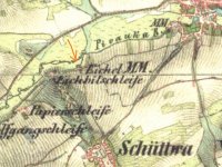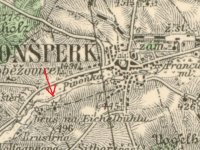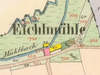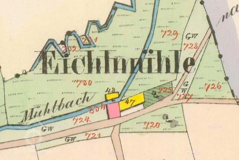 Je již na I. Vojenském mapování – josefském z let 1764-1768 a 1780-1783. Otisk a skica stabilního katastru z roku 1838: náhon, nespalná budova s další malou spalnou za náhonem, jedno kolo, větší spalná hospodářská budova, odtokový kanál, majitelem Wenzl Bök.