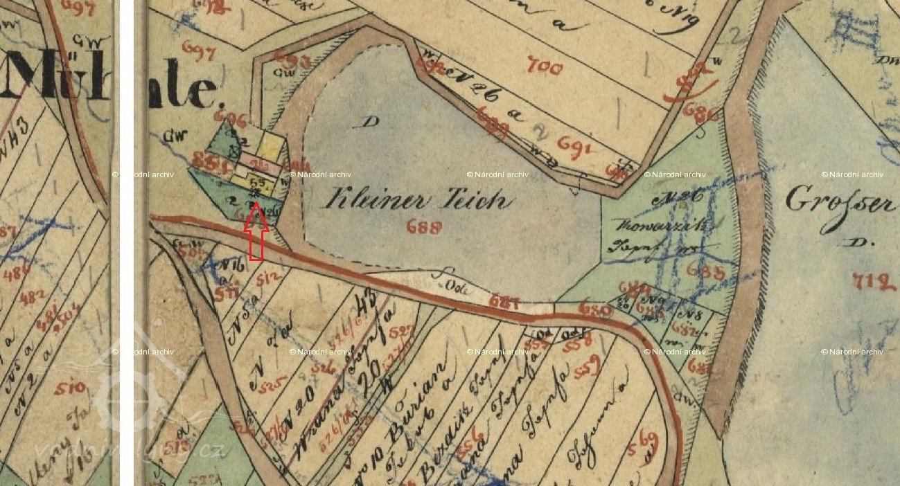 Mlýn je zakreslen na I. vojenském mapování z let 1764 -1768. Nad mlýnem byly 2 rybníky, Velký a Malý, které sloužily pro jeho pohon.