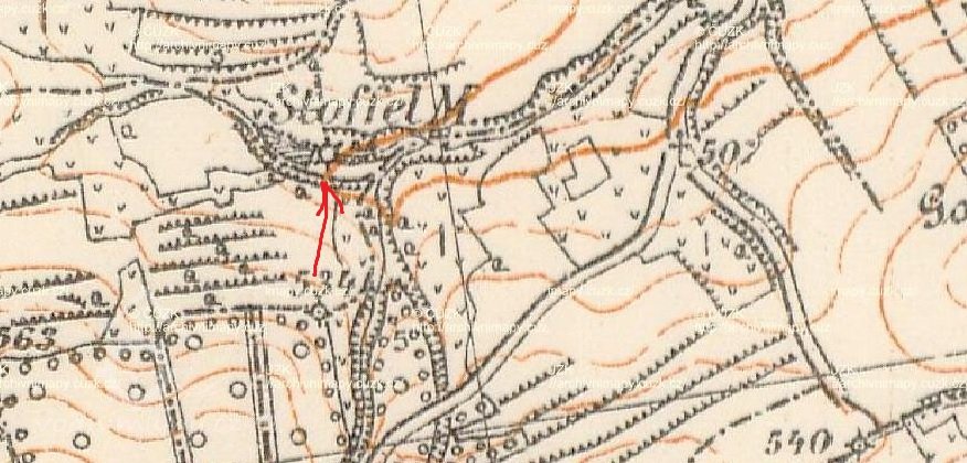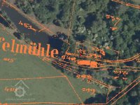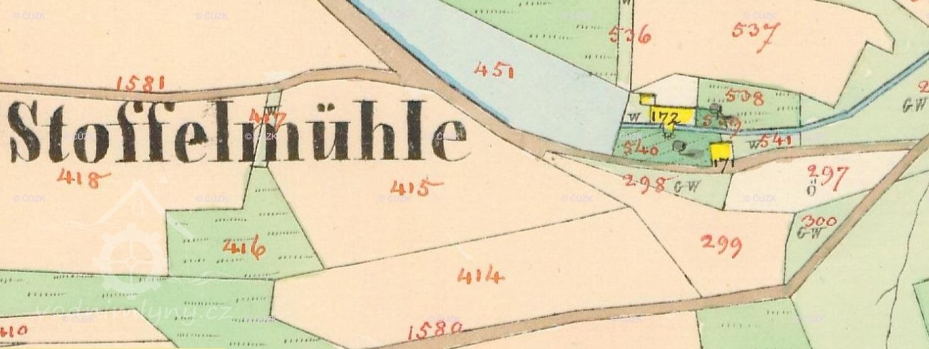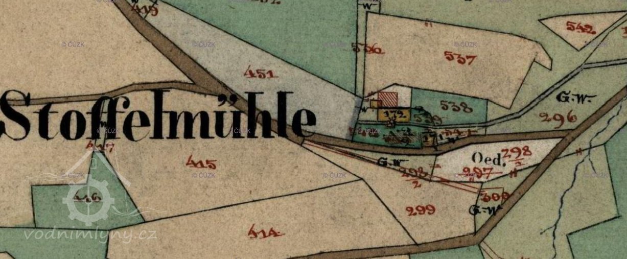 Stával téměř 2 km západně od centra obce, měl jeden byt, mlýn s pilou a stodolou, velká ovocná zahrada, pozemek 4,63 ha. Stál už v roce 1615.