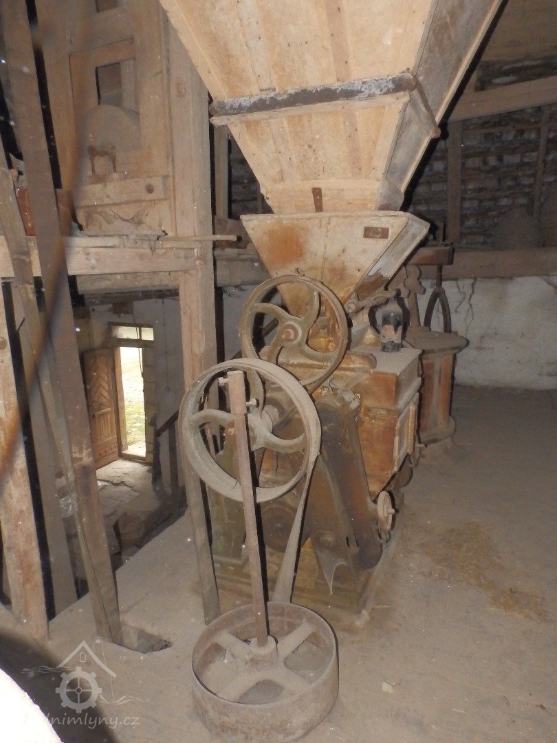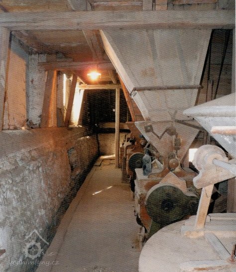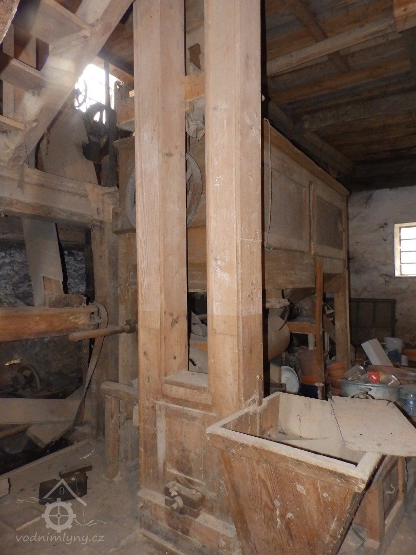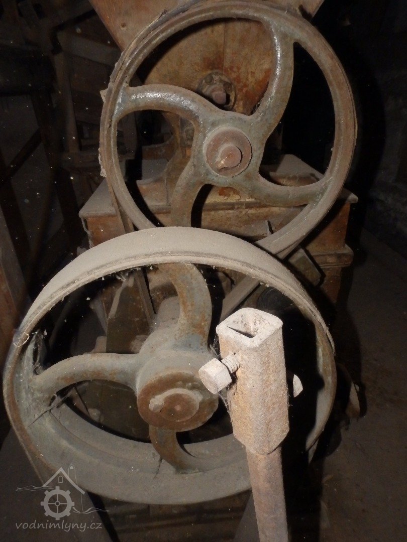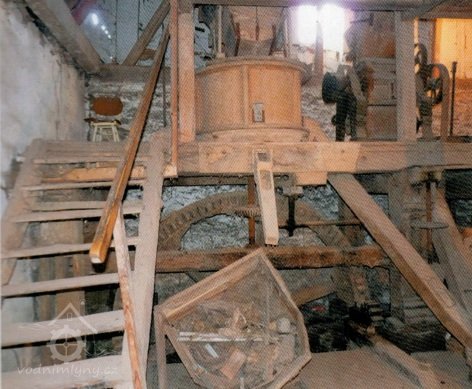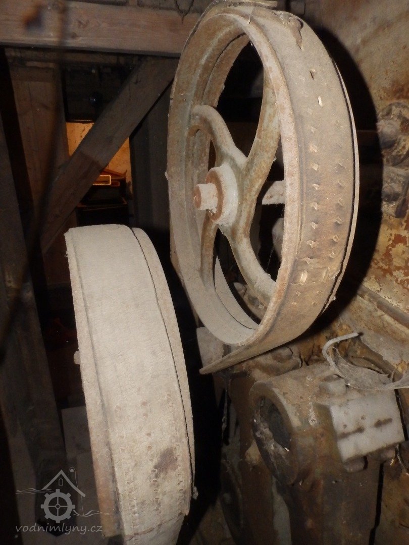 Pohled na podlážku s českým složením a válcovou stolicí, 2019, © doxa, (Prvky na obrázku: transmise, řemenice, převody - paleční kola, pastorky a cévníky (řemeslný výrobek), mlýnská hranice, kamenné složení (šrotovací, mlecí), válcová stolice)