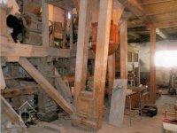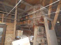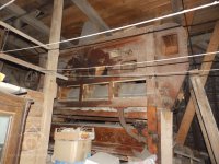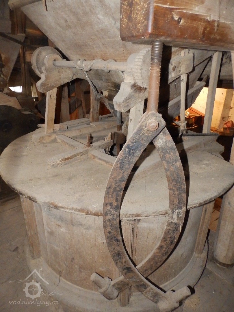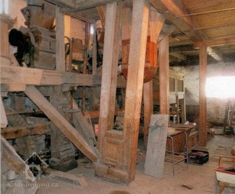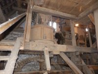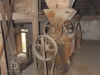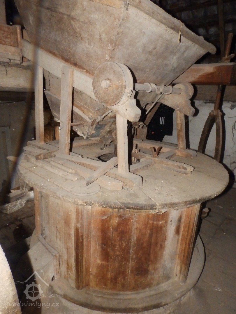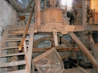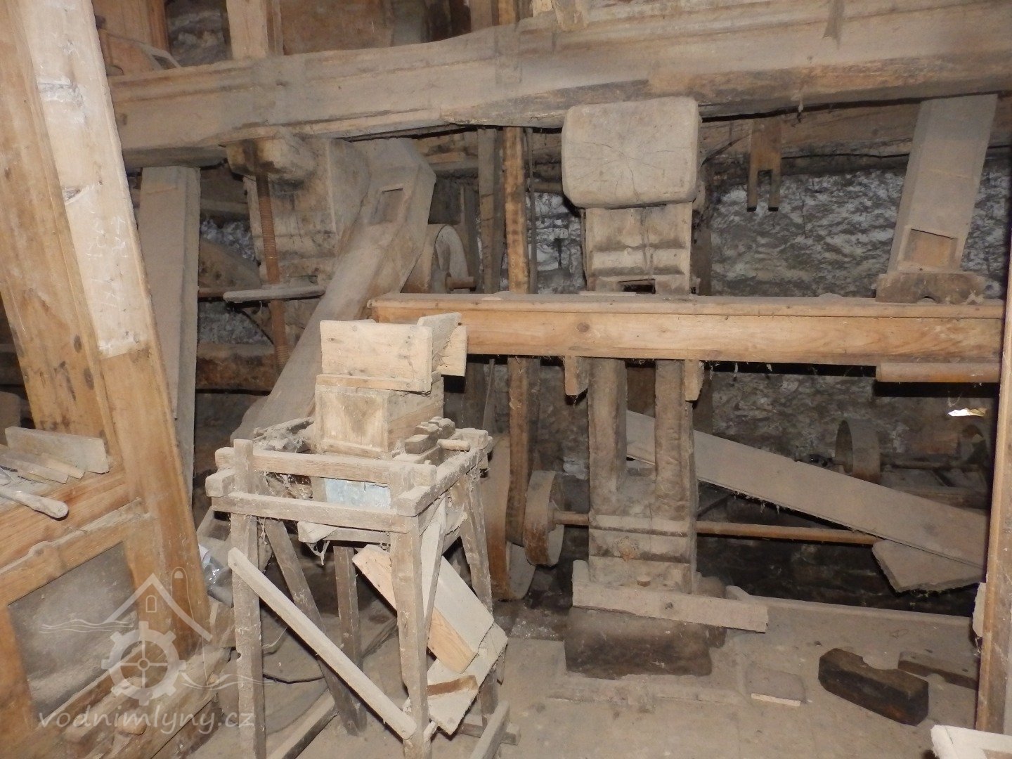 Pohled na podlážku s českým složením a válcovou stolicí, 2019, © doxa, (Prvky na obrázku: transmise, řemenice, převody - paleční kola, pastorky a cévníky (řemeslný výrobek), mlýnská hranice, kamenné složení (šrotovací, mlecí), válcová stolice)