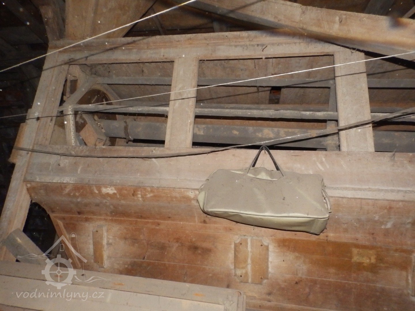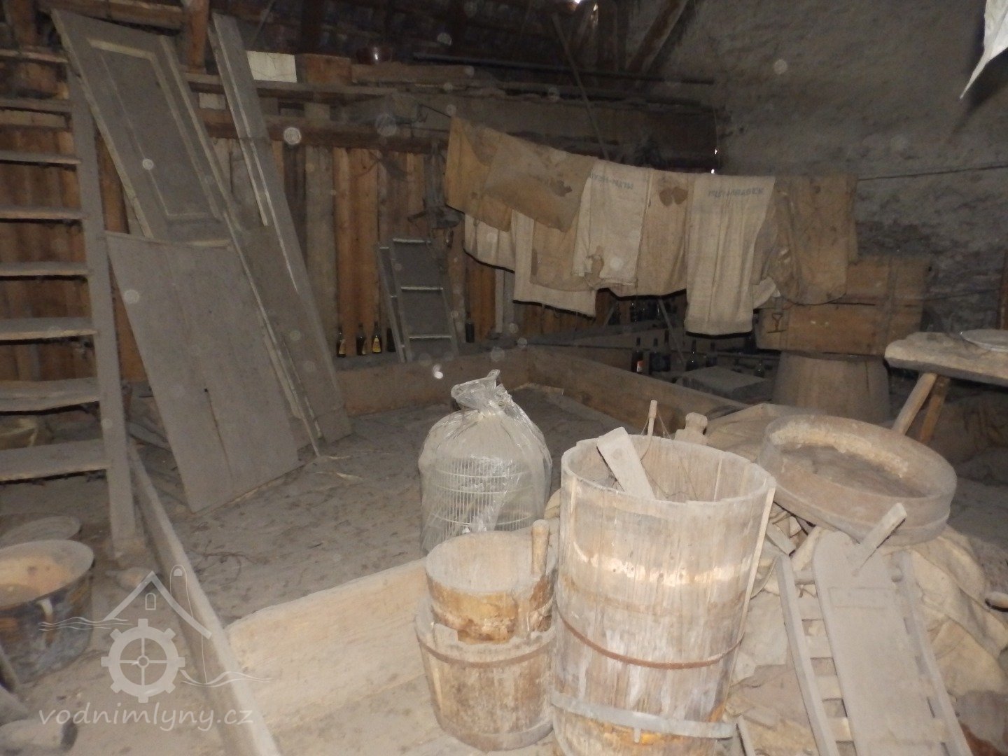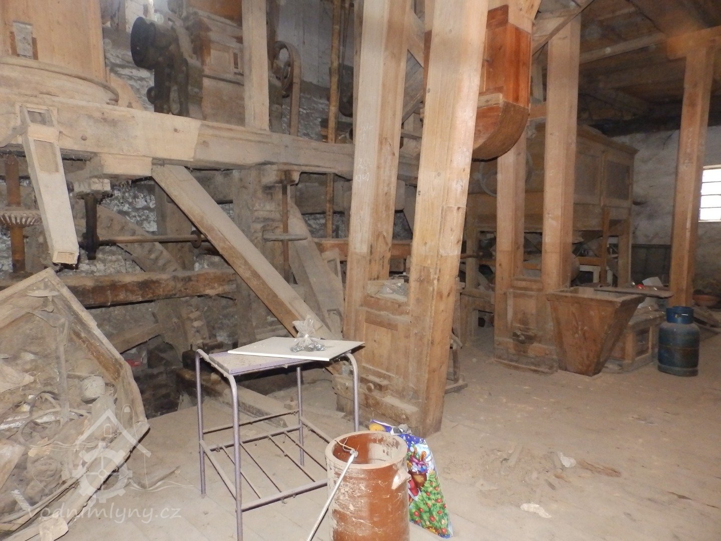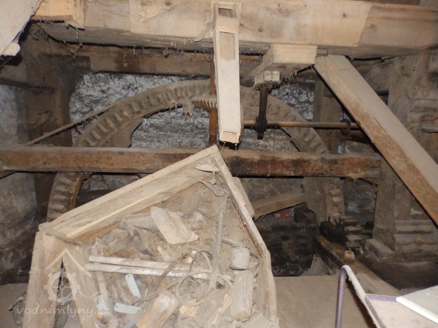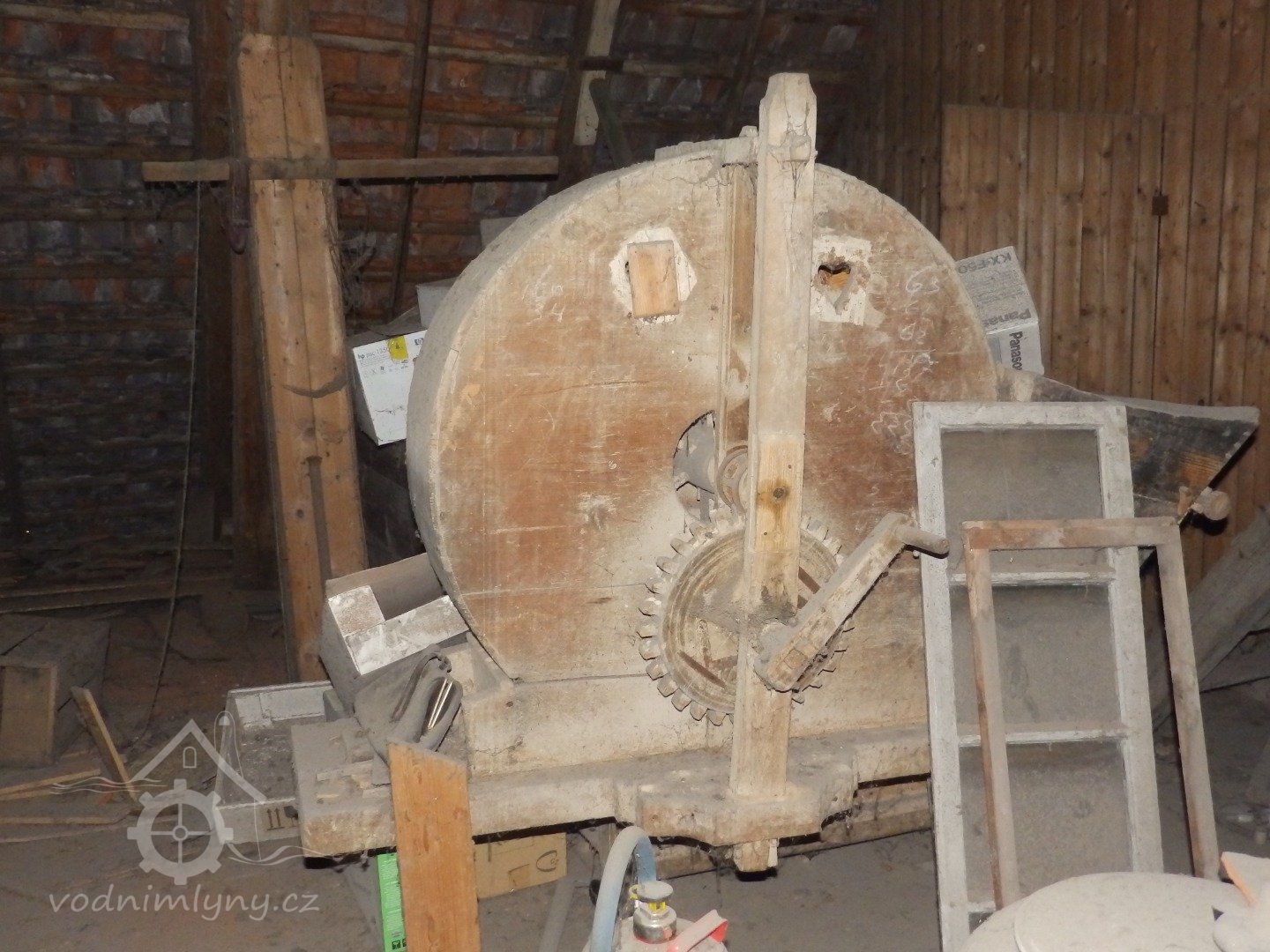 Pohled do interiéru, 2019, © doxa, (Prvky na obrázku: transmise, řemenice, převody - paleční kola, pastorky a cévníky (řemeslný výrobek), transmise, řemenice, převody - ozubená kola, pastorky (průmyslový výrobek), transmise, řemenice, převody - transmisní hřídele s řemenicemi (výrobek průmyslový i řemeslný), mlýnská hranice)