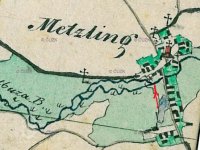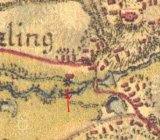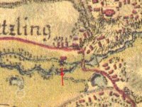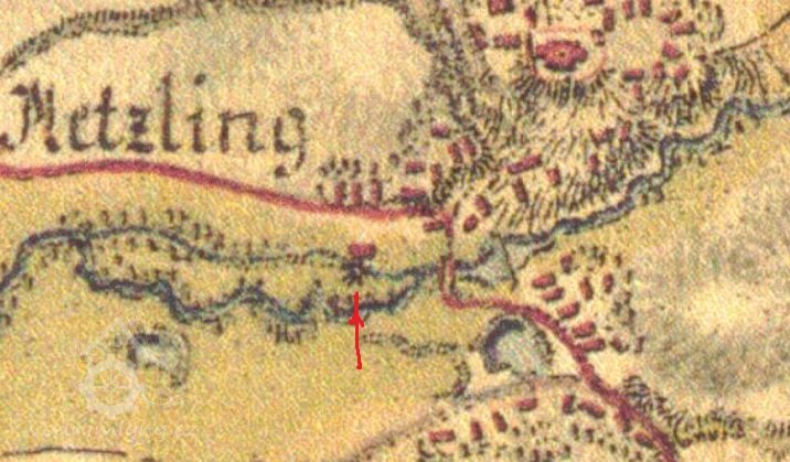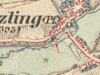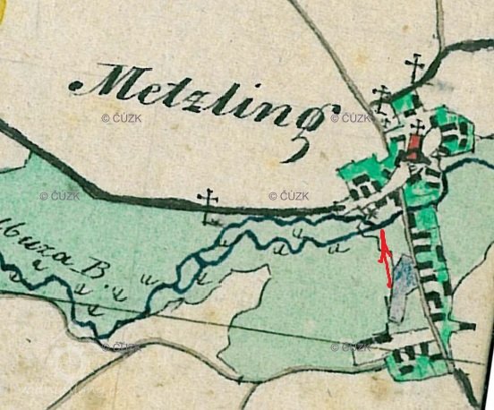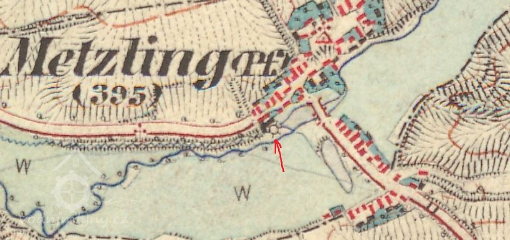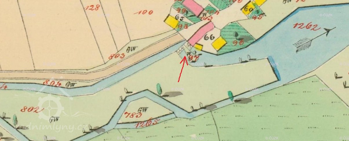 Zobrazen na I. vojenském mapování – josefském 1764-1768 a 1780-1783. Císařský povinný otisk stabilního katastru 1838 – dlouhý náhon, dlouhá nespalná budova s jedním kolem, menší dřevěný přístavek, další spalná budova, za areálem menší rybníček, na skice z téhož roku stejný stav, dvě kola, zaznamenány změny stavby, majitelem Josef Pavlík. Na originální mapě již přestavěná budova mlýna do písmene L, naproti ní zrcadlově umístěná další a mezi nimi malá spalná budova.