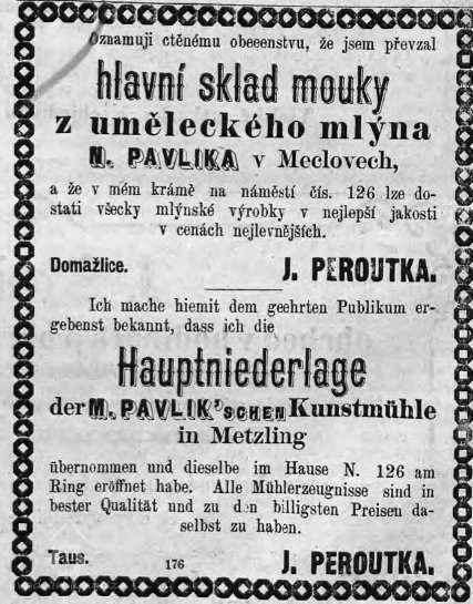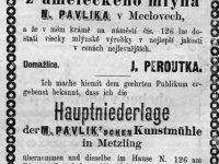 1921 - Jediné dochované sčítání obyvatel v roce 1921 uvádí jako majitele objektu M. Pavlíka, mlynářem je Josef Peter *1869 v Mirkovicích německé národnosti.