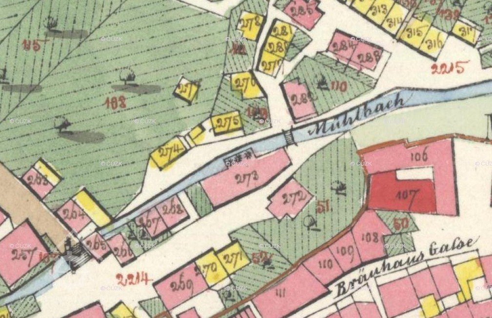 Mlýn se připomíná již r. 1488. V r. 1516 při jeho požáru uhořel i mlynář Meuten. Jeho těhotná manželka i s několika dětmi byla na poslední chvíli vytažena oknem.
