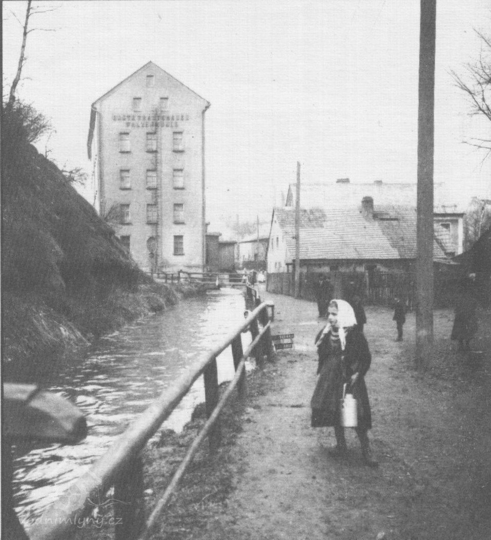 Mlýn se připomíná již r. 1488. V r. 1516 při jeho požáru uhořel i mlynář Meuten. Jeho těhotná manželka i s několika dětmi byla na poslední chvíli vytažena oknem. V r. 1534 znovu vyhořel. Na Vánoce 1580 spadla pod mlýnské kolo mlynářova dcerka. Vyvázla s těžkým zraněním. V r. 1831 zakoupil mlýn továrník Josef Etrich. V r. 1883 byl mlýn modernizován na válcový. 27. září 1912 se přehřálo ložisko stroje na čištění obilí a mlýn shořel. V té době vlastnil mlýn Jan Fiedler. Sedm hasičských stříkaček svedlo marný čtyřhodinový boj s ohněm. Hořící mouka hnaná větrem dopadala na okolní střechy. Mlýnské stroje se propadly ze 4. do 2. patra. Shořelo 700 q pšenice, 100 q žita, 300 q žitné mouky, 200 q krup a 40 tisíc jutových pytlů. Po požáru byl mlýn obcí přebudován na vodní elektrárnu. Zdroj: Městské kroniky
