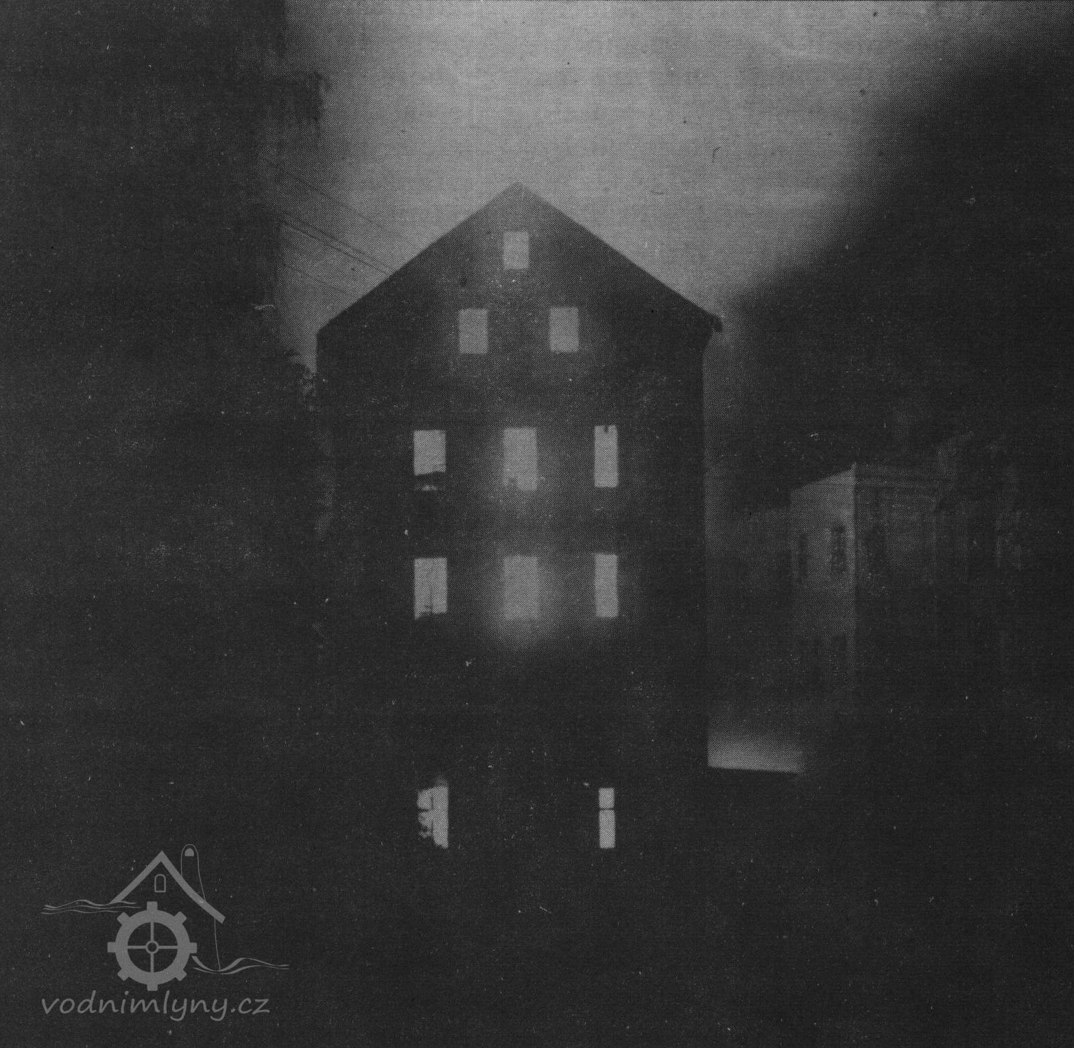 27. září 1912 se přehřálo ložisko stroje na čištění obilí a mlýn shořel. V té době vlastnil mlýn Jan Fiedler. Sedm hasičských stříkaček svedlo marný čtyřhodinový boj s ohněm. Hořící mouka hnaná větrem dopadala na okolní střechy. Mlýnské stroje se propadly ze 4. do 2. patra. Shořelo 700 q pšenice, 100 q žita, 300 q žitné mouky, 200 q krup a 40 tisíc jutových pytlů. Po požáru byl mlýn obcí přebudován na vodní elektrárnu.