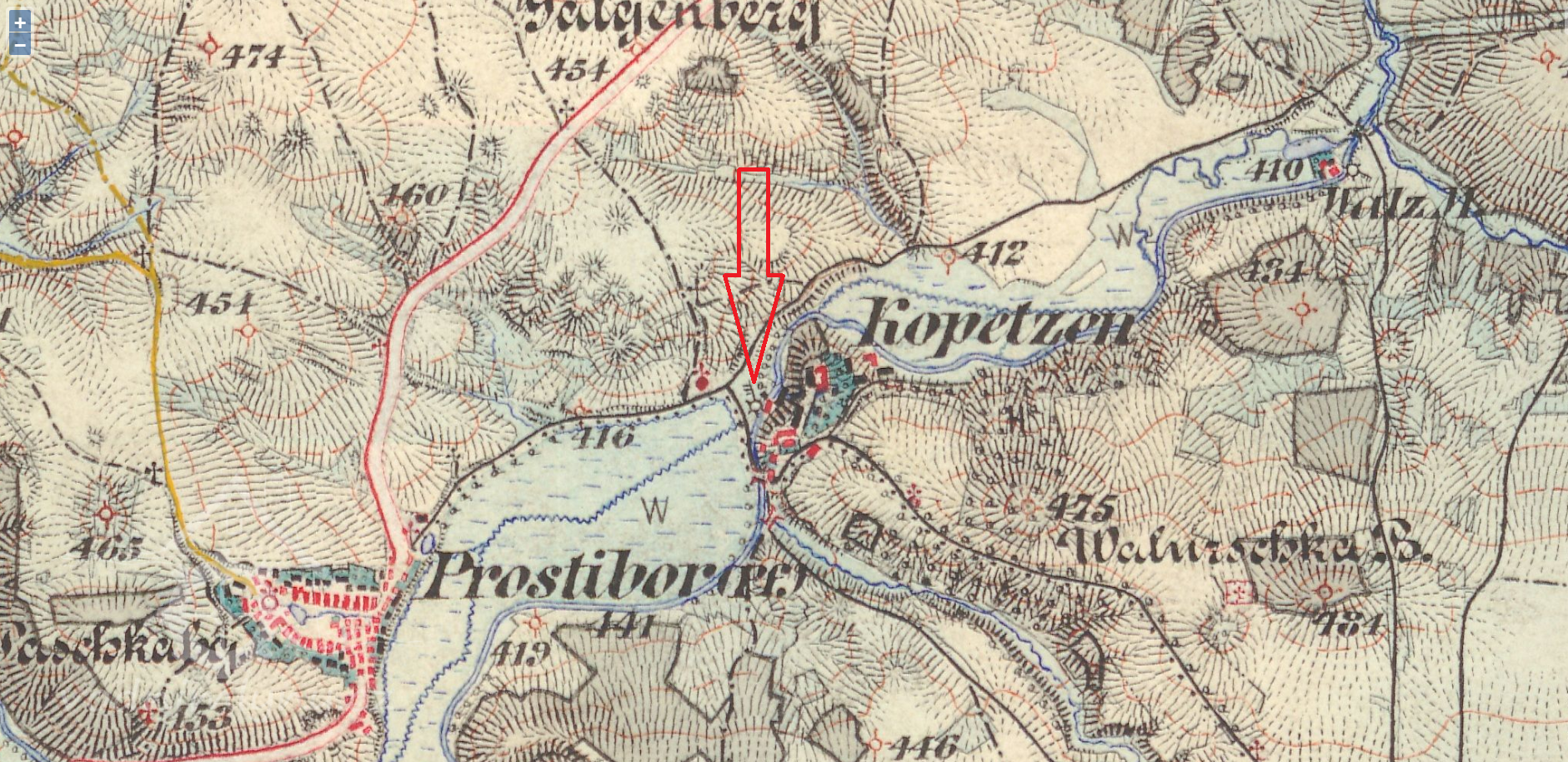 Bis 1805/06 ist die Schlossmühle unter Kopetzen 6 geführt, danach Kopetzen 5. Die Standesfälle sind in der Pfarre Prostibor.