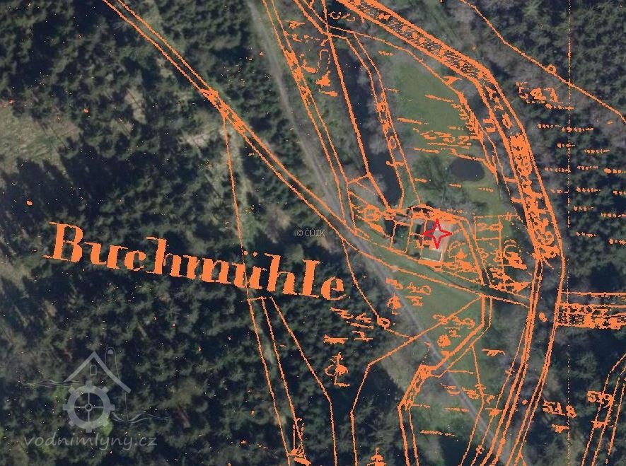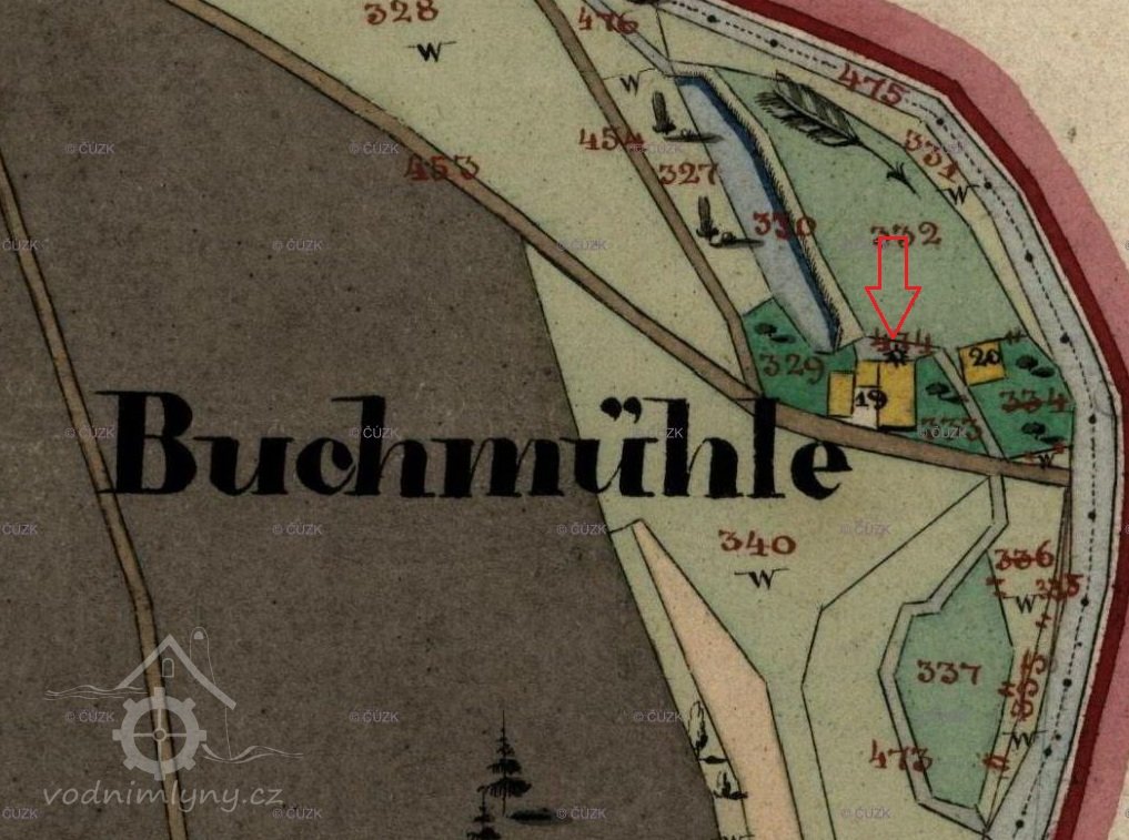 Mlýn byl založen tepelským klášterem patrně v 1. polovině 18. století, objevuje se na mapách I. vojenského mapování z let 1764 – 1768. V roce 1798 se objevuje pod názvem Puchmühle, v 19. století je na mapách označen pod názvem Buchmühle nebo Buhmühle. Spadal pod pístovskou faru.