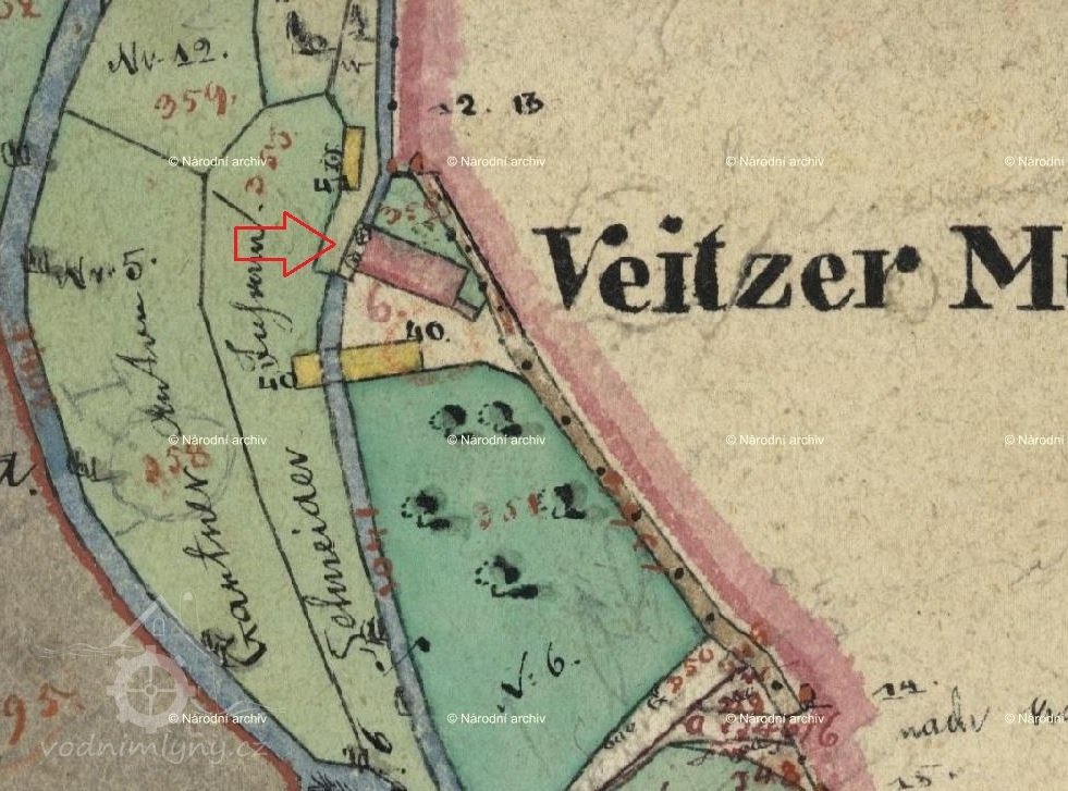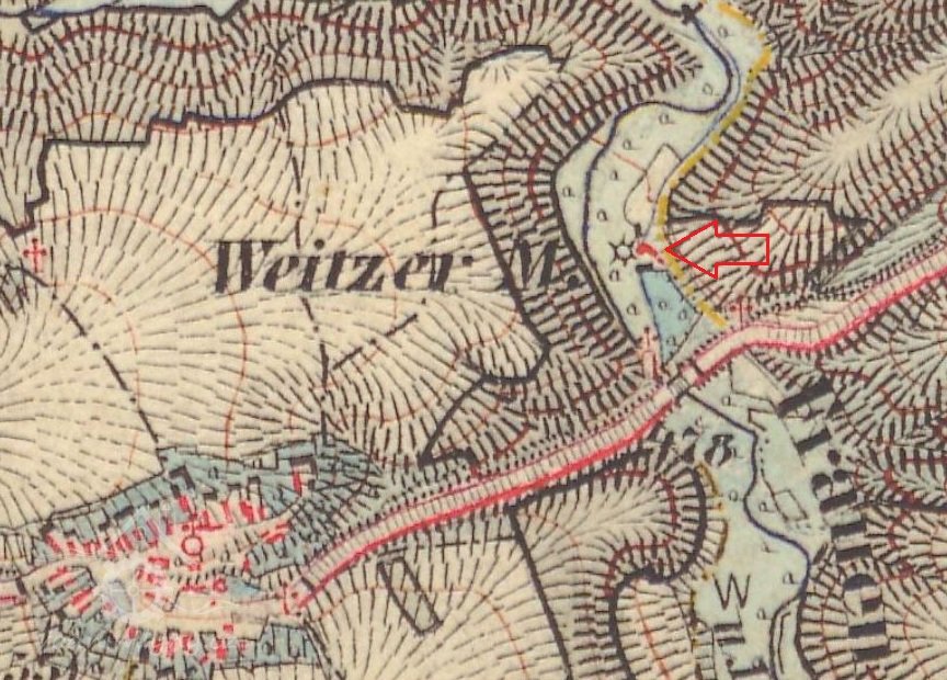 V roce 1804 je na vrchnostenském mlýně Weitsmühle zmiňován nájemce Josef Schneider. Mlýn měl 2 složení a 1 pilu. Mlynář platil vrchnosti nájem 7 zlatých ze mlýna a 1 zlatý z pily. Navíc měl povinnost vrchnosti pořezat bezplatně 10 kmenů na prkna.