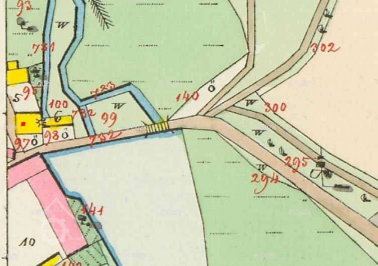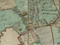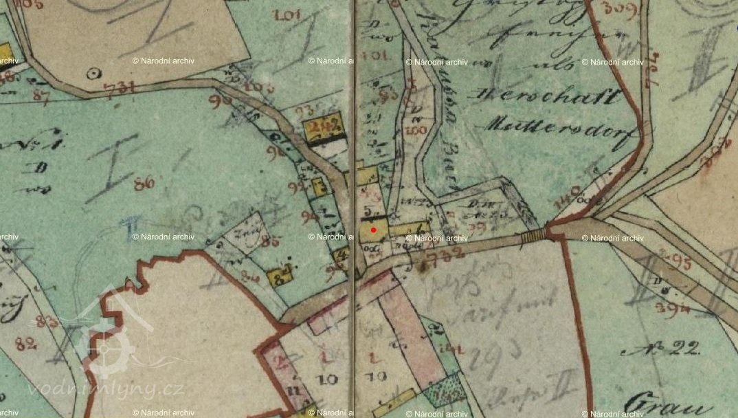 1838 – indikační skica a otisk stabilního katastru – č. 23 – spalná budova s dalším obdélníkovým přístavkem, jedno kolo, majitelem mutěnínský Vidršpergár.