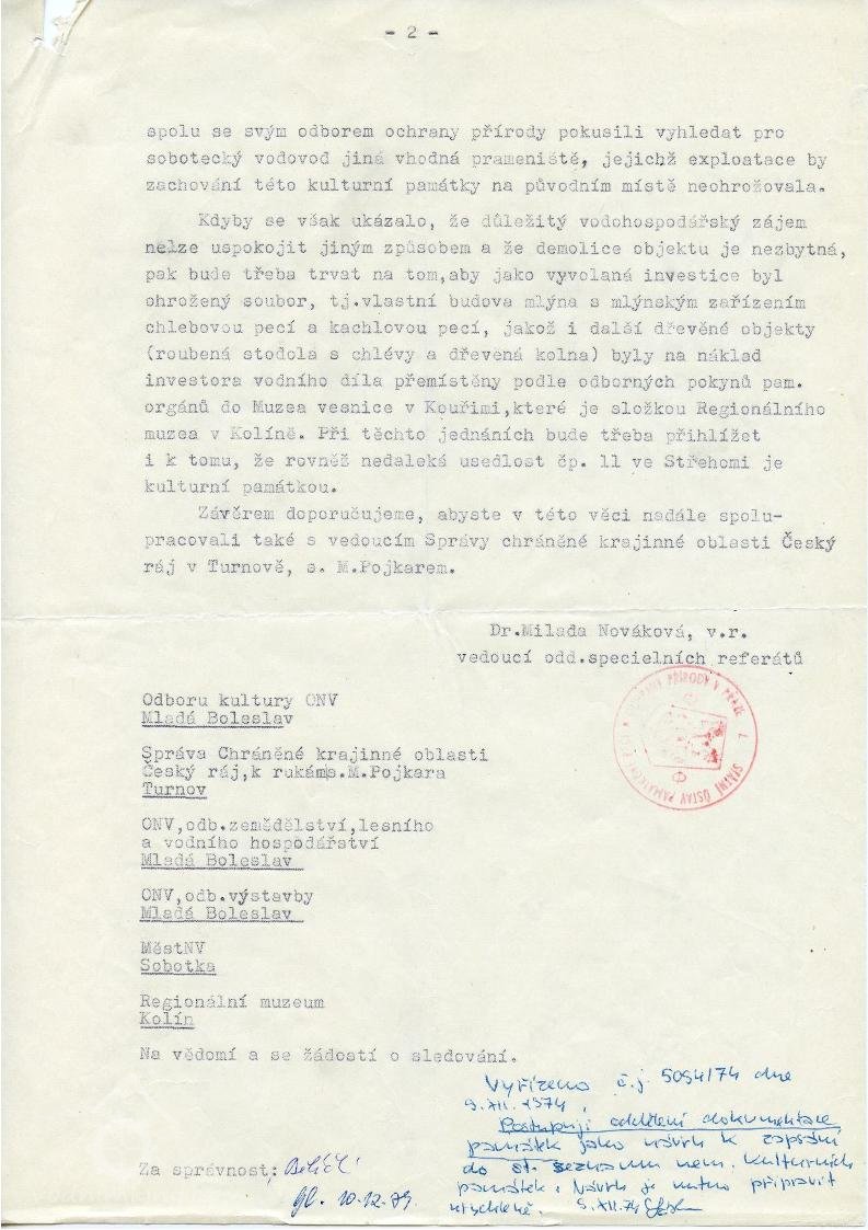 S Vaším stanoviskem ve věci Opočenských mlýna ve Střehomi, obec Horní Bouzov, okr. Mladá Boleslav, vyjádřeným pod Vaším čj.3650/74 z 12.9.1974 se ztotožňujeme. Budova mlýna je postavená na rozhraní 18. a 19. století a patří k posledním mlýnům tohoto typu u nás, zejména proto, že je možno mlýn uvést do chodu. Mlýnice je roubená stavba, která má v přízemí obytné části roubení nahrazeno zdivem. Ostatní stěny jakož i krov jsou původní. Také zařízení mlýnice je původní i s mlýnským dřevěným kolem, pouze vodní pohon mlýnského zařízení byl v posledních 20 letech nahrazen elektromotorem. Kromě mlýnice patří k objektu mlýna roubená stodola a chlév, zděná stodola s dřevěným bedněným štítem a dřevěná kolna, ve které je umístěna truhlářská dílna. Současný stavební stav objektu je velmi dobrý. Střecha je kryta pálenými taškami a tím byla zaručena kvalitní ochrana krovu, jakož i ostatních dřevěných konstrukcí - strop, mlýnské zařízení. Také roubené stěny jsou zachované, stěny nejsou prohnilé, ani napadené červotočem, nebo jinak poškozené. Kromě zařízení mlýnice je v objektu původní chlebová pec a kachlová pec v obytné části objektu. Jde tedy o kulturní památku lidové architektury a zároveň i památku techniky, která by měla být zapsána do st. seznamu nem. kult. památek. Doporučujeme Vám proto, abyste nám předložili potřebný návrh. Vzhledem k ustanovení § 2 a § 7 odst. 1 zákona č. 22/1956 Sb. o kulturních památkách, a to 21. odst. 1 zákona Č. 87/1958 Sb. o stavebním řádu, jakož i § 53 vyhlášky č. 144/1959 Ú.l. vydané k provedení tohoto zákona, doporučujeme, abyste provedli potřebné kroky u přísl. stavebního úřadu a u příslušného orgánu vodohospodářského, směřující k zachování této památky, včetně přilehlého souboru hospodářských budov (§ 2 odst. 2 zák. č. 22/1958 Sb.) na původním místě. V této souvislosti dále doporučujeme, abyste se si spolu se svým odborem ochrany přírody pokusili vyhledat pro sobotecký vodovod jiná vhodná prameniště, jejichž exploatace by zachování této kulturní památky na původním místě neohrožovala. Kdyby se však ukázalo, že důležitý vodohospodářský zájem nelze uspokojit jiným způsobem a že demolice objektu je nezbytná, pak bude třeba trvat na tom, aby jako vyvolaná investice byl ohrožený soubor, tj. vlastní budova mlýna s mlýnským zařízením, chlebovou pecí a kachlovou pecí, jakož i další dřevěné objekty (roubená stodola s chlévy a dřevěná kolna) byly na náklad investora vodního díla přemístěny podle odborných pokynů pam. orgánu do Muzea vesnice v Kouřimi, které je složkou Regionálního muzea v Kolíně. Pří těchto jednáních bude třeba přihlížet i k tomu, že rovněž nedaleká usedlost čp. 11 ve Střehomi je kulturní památkou. Závěrem doporučujeme, abyste v této věci nadále spolupracovali také s vedoucím správy chráněné krajinné oblasti Český ráj v Turnově, s. M. Pojkarem.