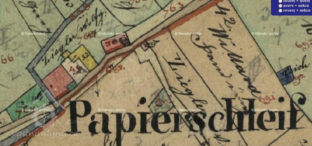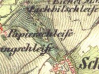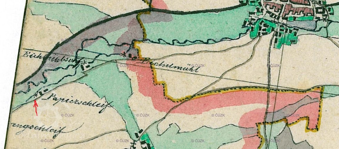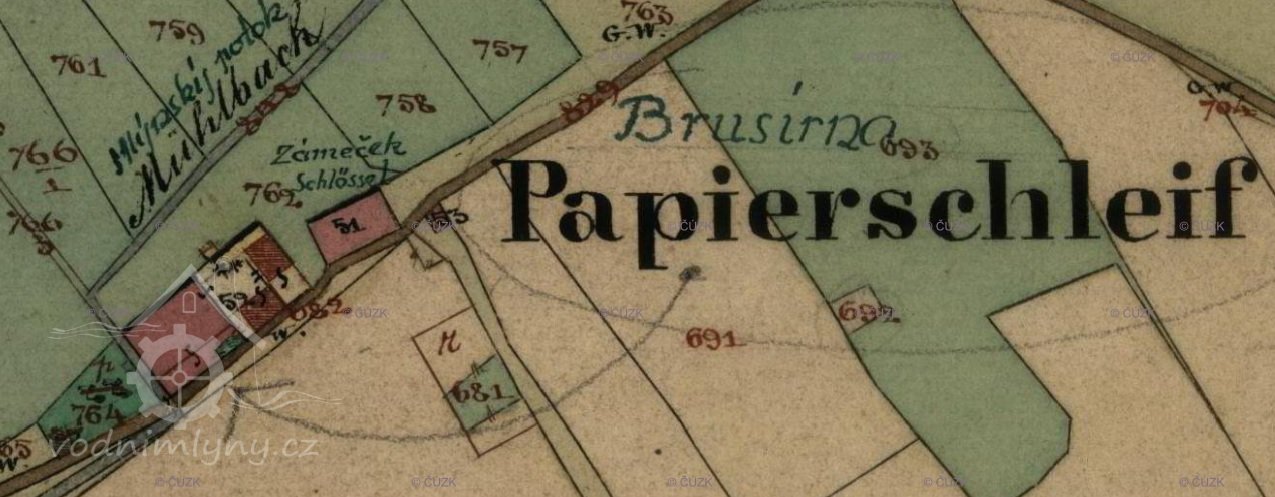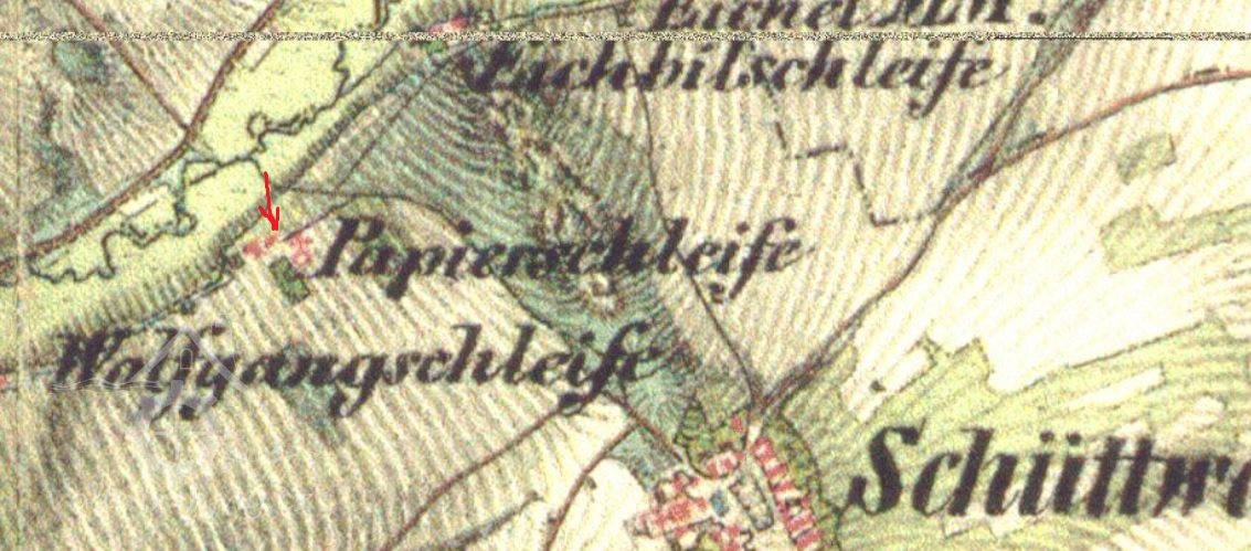 Původně velice starý a zajímavý provoz. V historických pramenech je nazýván Horní šitbořskou leštírnou, Papierschleife nebo Schlösschen – Zámeček. Již v 17. století stávala v těchto místech papírna pivoňského kláštera, jejíž pustnoucí stavbu obnovil v roce 1746 pivoňský převor Cyriak Wotava. Provoz je zobrazen na I. vojenském mapování – josefském (1764-1768 a 1780-1783). V roce 1824 vyměnil zdejší papírník Josef Bock (Beck) starou papírnu s Janem Wolfgangem Zieglerem za papírnu na východním okraji Poběžovic. V letech 1835 – 1836 zde Wolfgang dal upravit starou papírnu na brusírnu a vystavět obytnou budovu, nazývanou Schlösschen. O budově tzv. Zámečku, postaveného v těsné blízkosti leštírny, kolovaly pověsti o tom, že tu prý straší.
