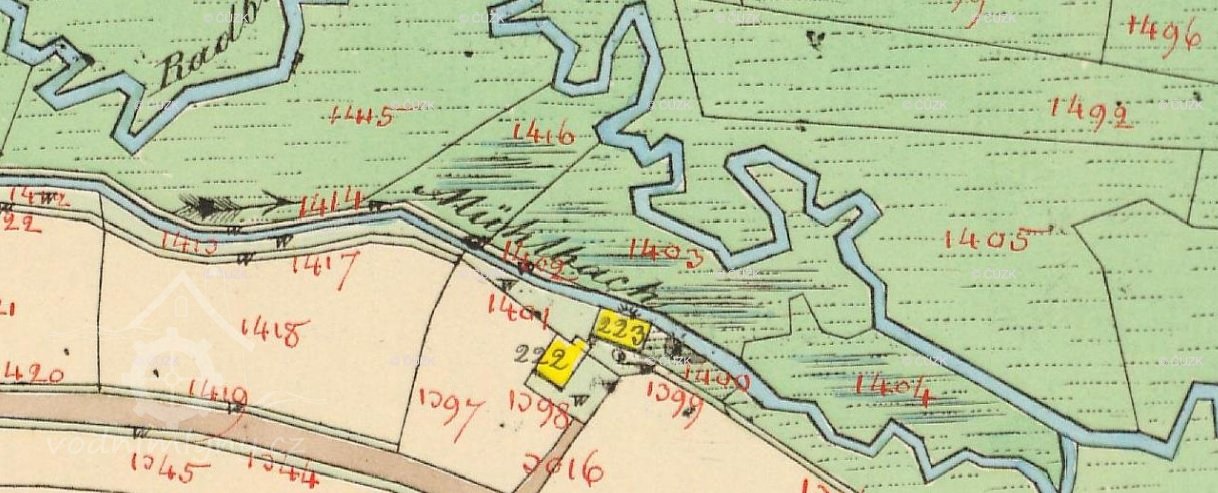 1838 – Na skice i otisku stabilního katastru je na náhonu z Radbuzy zakreslena obdélníková, ještě spalná budova s jedním kolem a nad ní druhá spalná budova. Majitelem Anton Czada.