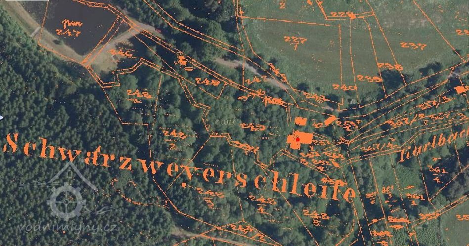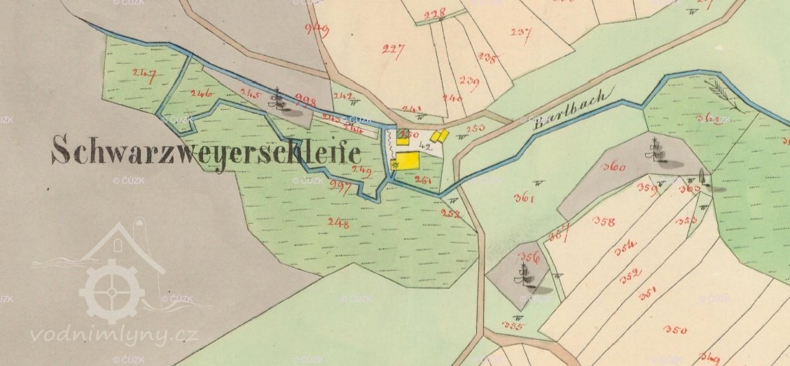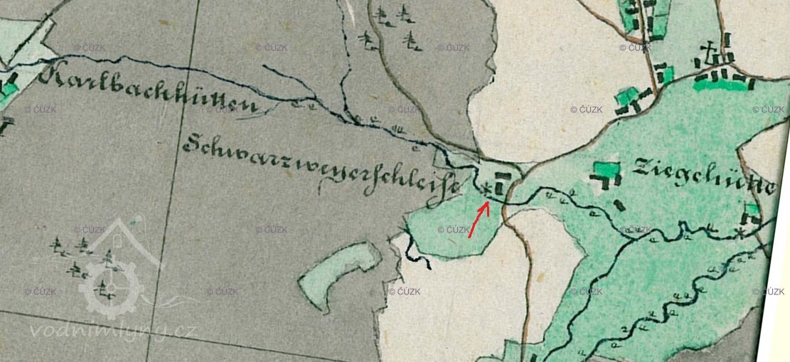 Lokalita Schwarzweier, někde nazývaná Schwarzsäge, se nachází v údolí Huťského potoka (dříve Karlbach) u cesty ze Smolova do Karlovy Hutě. Původně objekt fungoval jako brusírna skla patřící pod Neuhofer Spiegelfabrique, následně pila a mlýn.