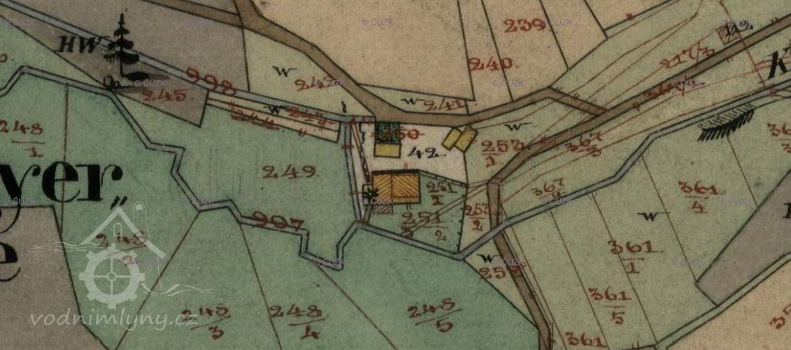 1930 – Seznam a mapa vodních děl Republiky československé uvádí Karlův potok – Smolov – Jindřich Kotz – mlýn – 1 kolo na svrchní vodu – 0,086-6,14-4,4
