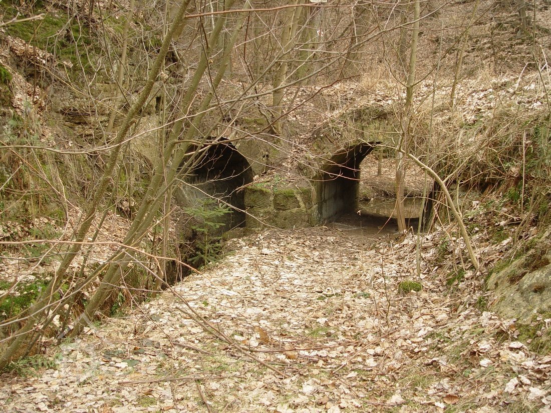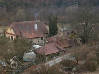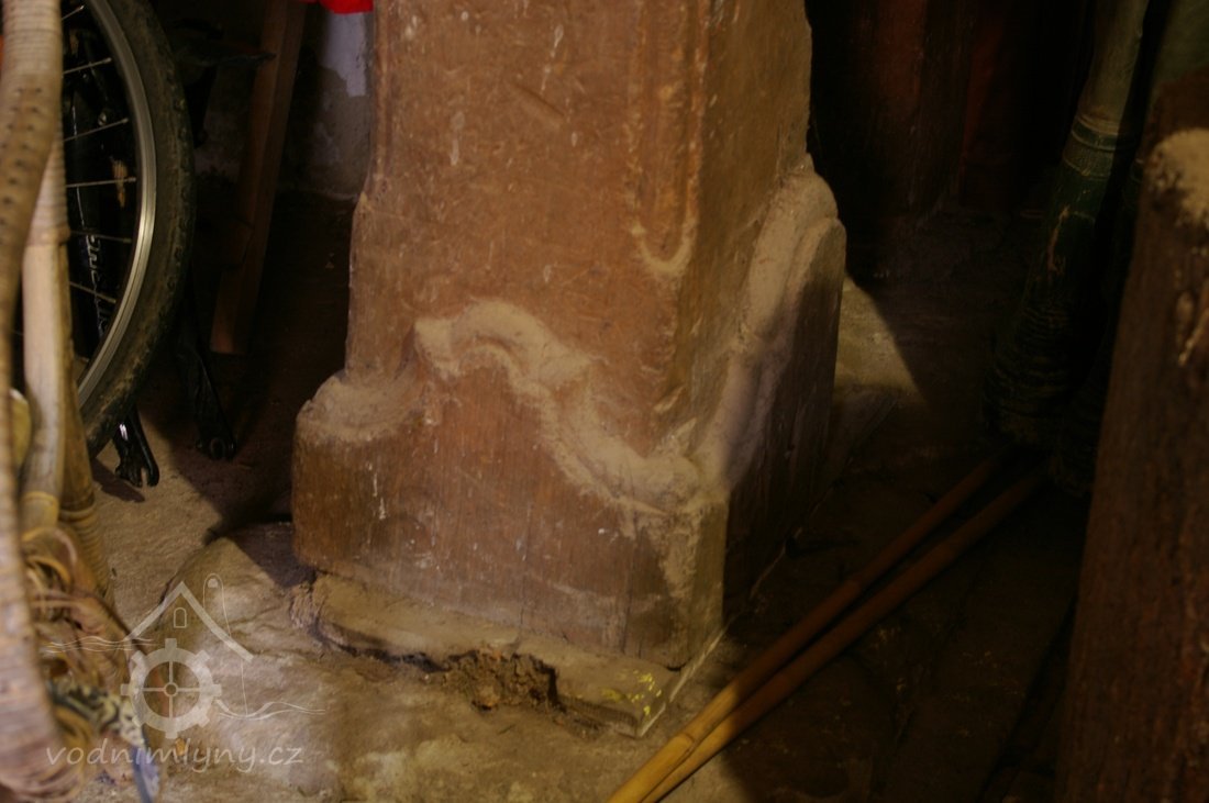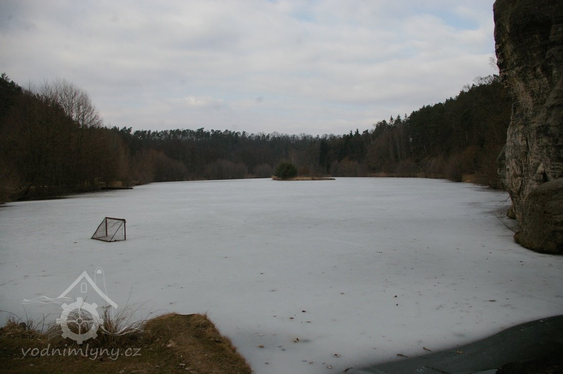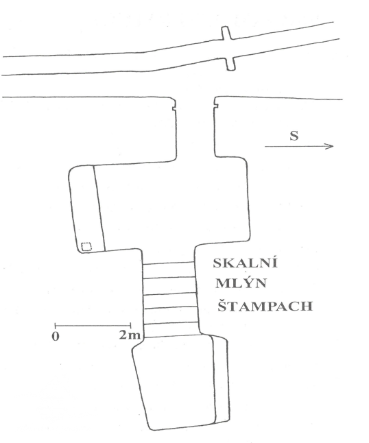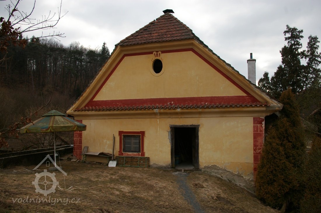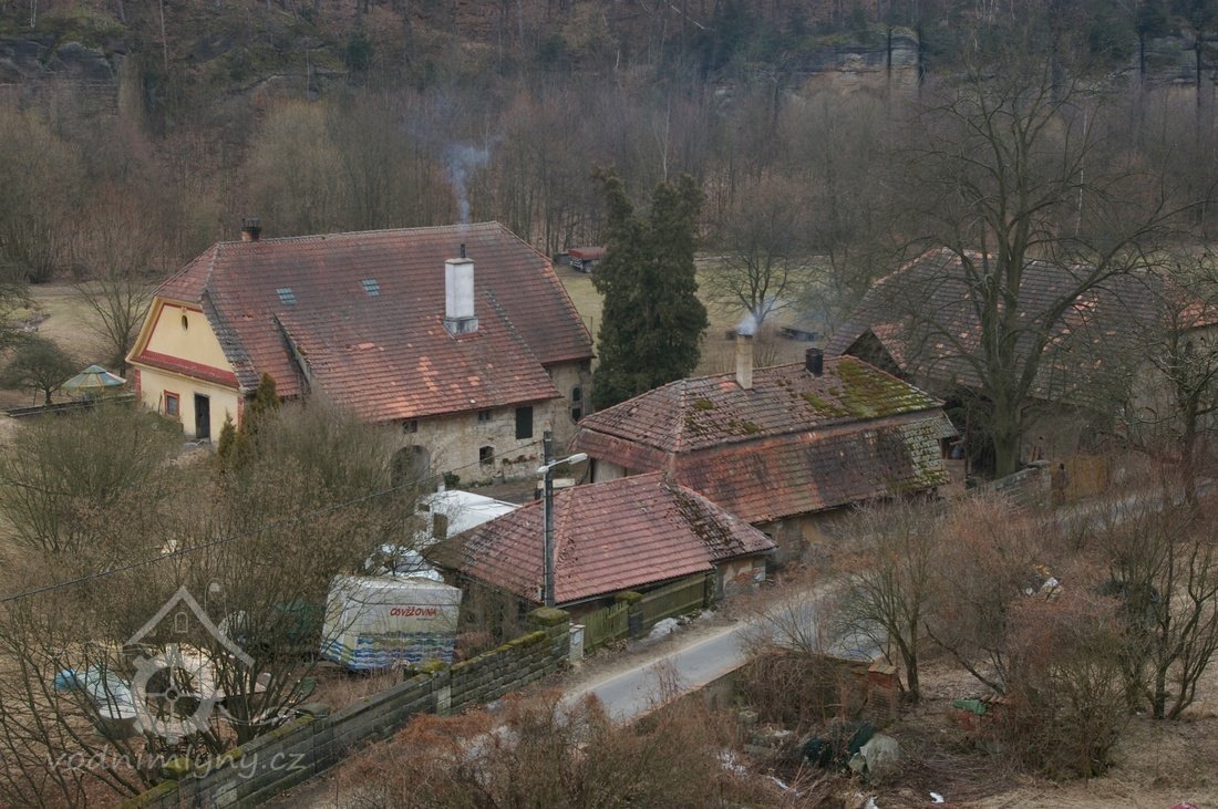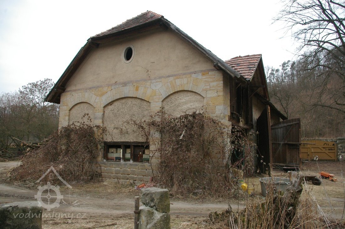 Zděný mlýn leží pod obnoveným rybníkem, jehož výpust má strouhu vysekanou ve skále. Na jejím dně je prosekané obdobné požírací koryto jako na Tuboži. Nad strouhou je vstup do dvou prostor, vysekaných v pískovcovém masivu. První je ve výškové úrovni vstupu, do druhé se sestupuje z první po sedmi schodech. Ve vstupu jsou patrné stopy po zárubních a uzavírání objektu. Jedná se o komoru a níže umístěný sklep, přístupné z protější strany strouhy po dřevěné lávce. Jejich zdánlivě neobvyklé umístění v situaci staveb mlýna je vzhledem k užitému materiálu právě typické, k zahloubení byla využita usedlosti nejbližší pískovcová skála. Způsob práce v lomové stěně i při vysekání objektu odkazuje do pokročilého novověku.