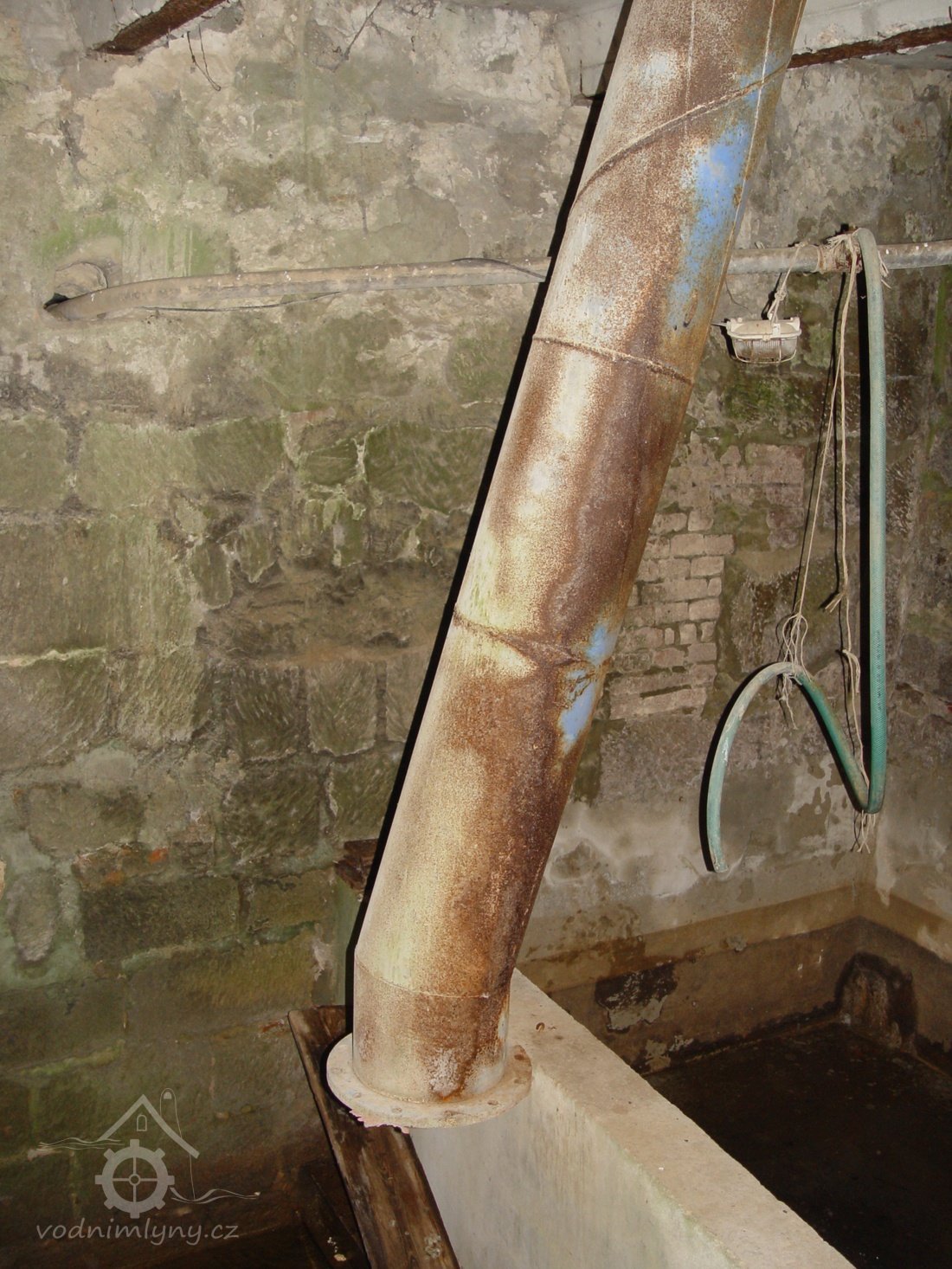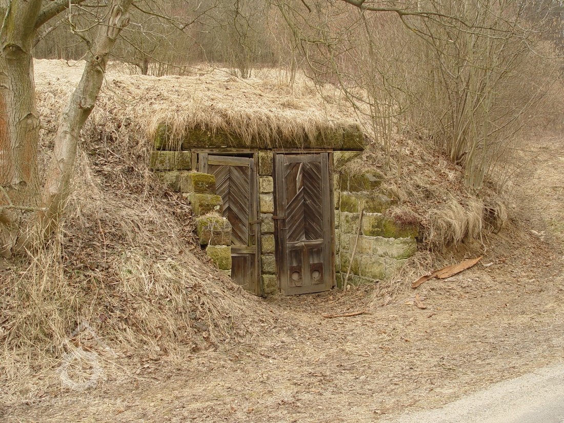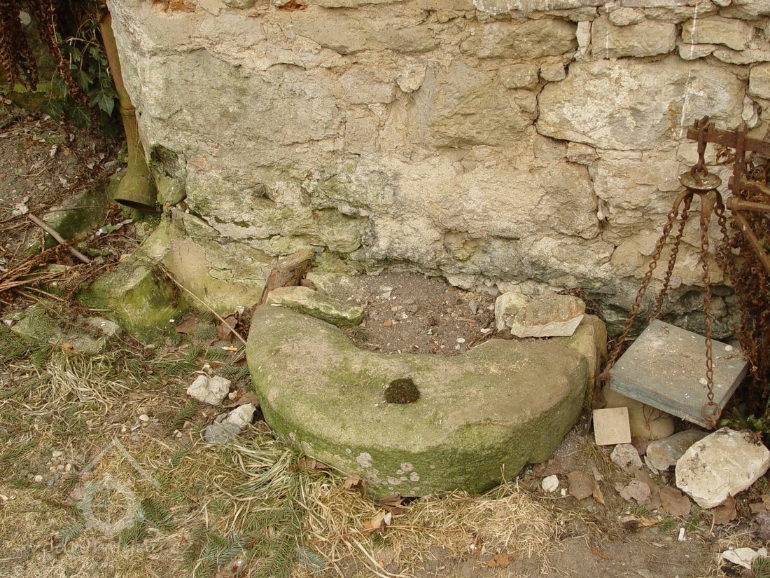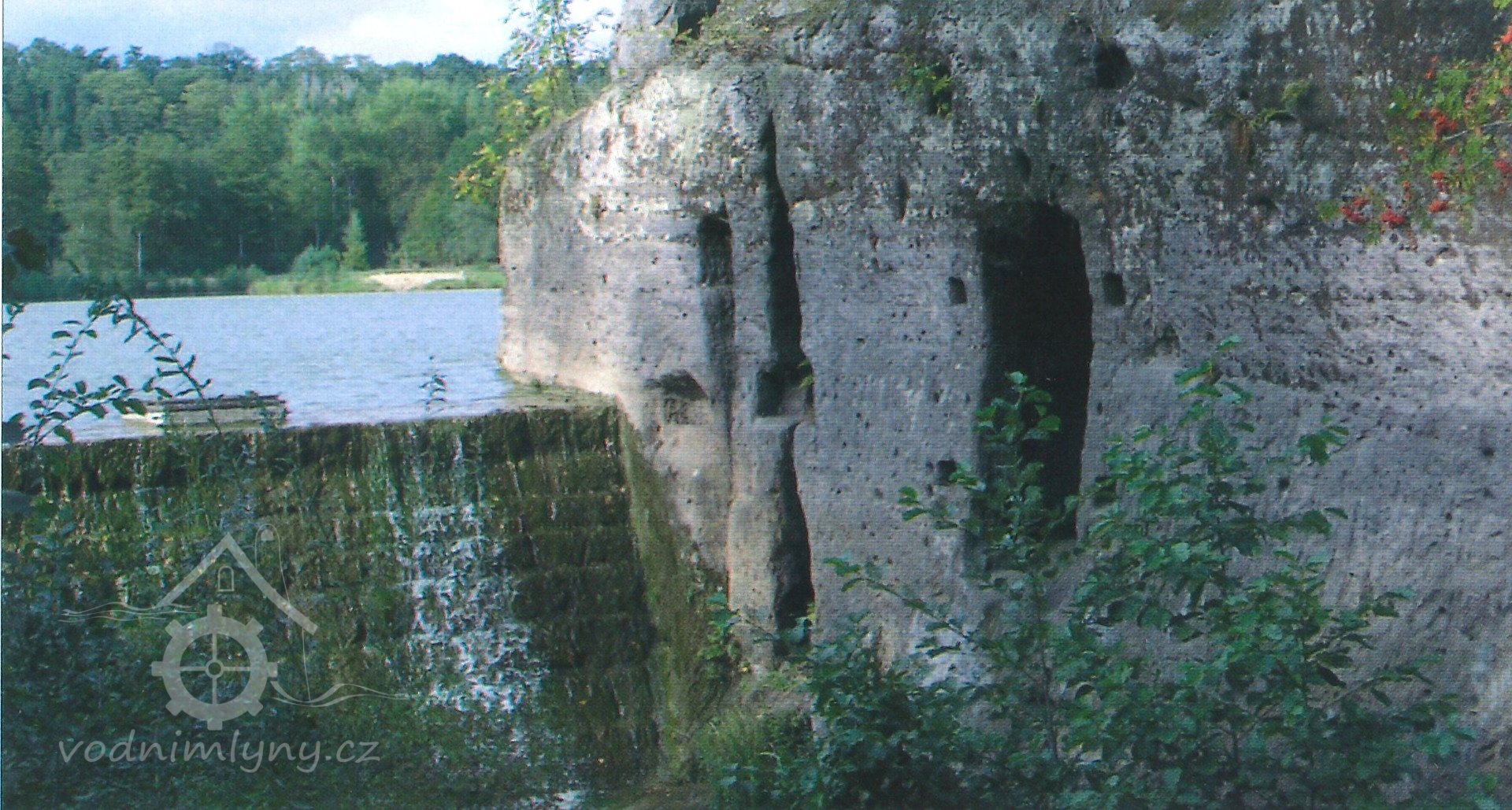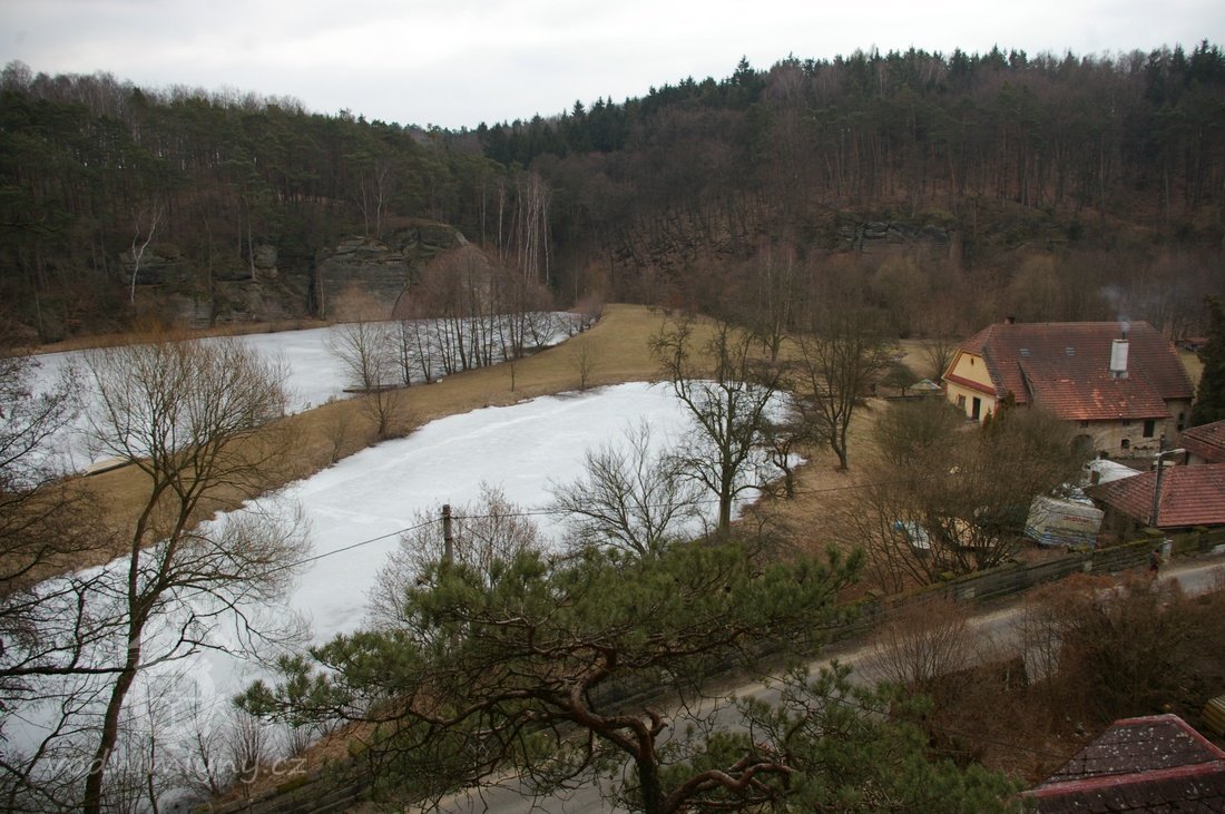 Zděný mlýn leží pod obnoveným rybníkem, jehož výpust má strouhu vysekanou ve skále. Na jejím dně je prosekané obdobné požírací koryto jako na Tuboži. Nad strouhou je vstup do dvou prostor, vysekaných v pískovcovém masivu. První je ve výškové úrovni vstupu, do druhé se sestupuje z první po sedmi schodech. Ve vstupu jsou patrné stopy po zárubních a uzavírání objektu. Jedná se o komoru a níže umístěný sklep, přístupné z protější strany strouhy po dřevěné lávce. Jejich zdánlivě neobvyklé umístění v situaci staveb mlýna je vzhledem k užitému materiálu právě typické, k zahloubení byla využita usedlosti nejbližší pískovcová skála. Způsob práce v lomové stěně i při vysekání objektu odkazuje do pokročilého novověku.