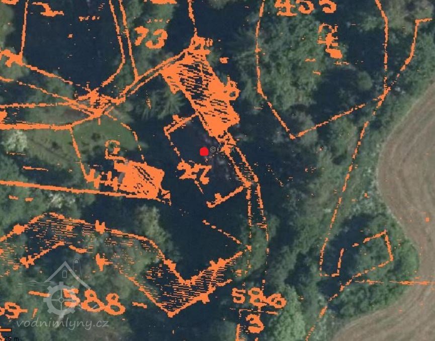 Nad mlýnem býval panský rybník, 1881 již zaniklý, zachována hráz.