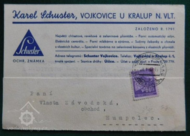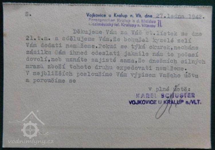 Podpis mlynáře a razítko, 1942, © autor neznámý (viz aukro.cz), (Prvky na obrázku: podpis mlynáře, razítko)