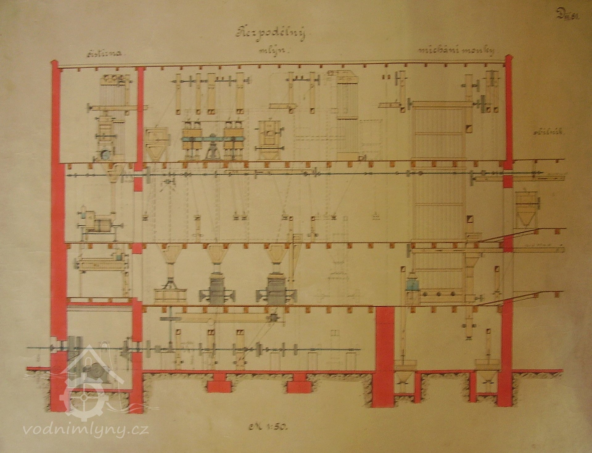 Podélný řez mlýnicí. Soukromá sbírka, před 1910, © autor neznámý