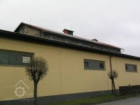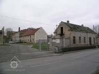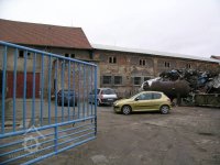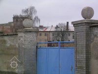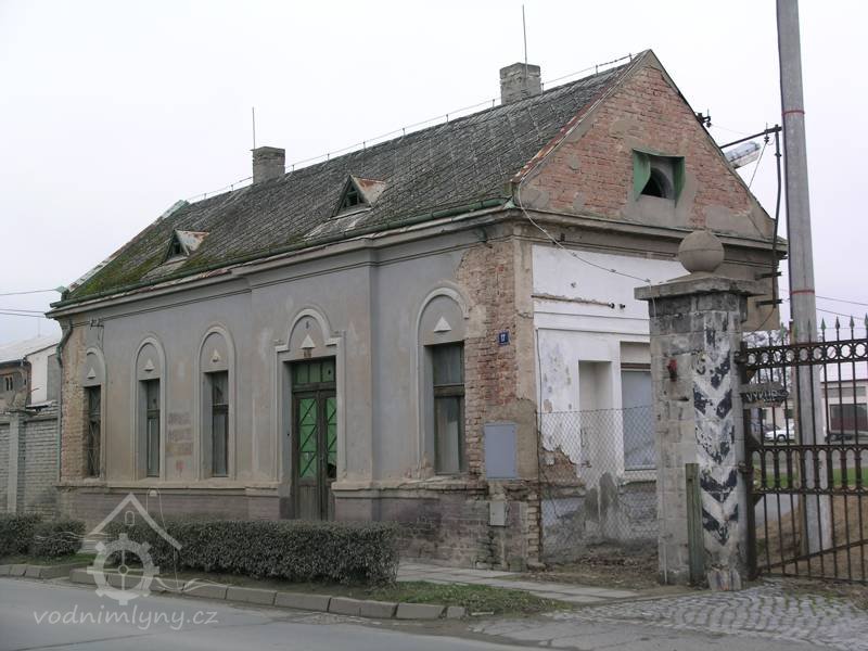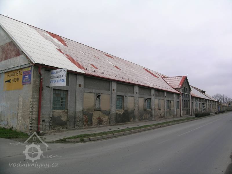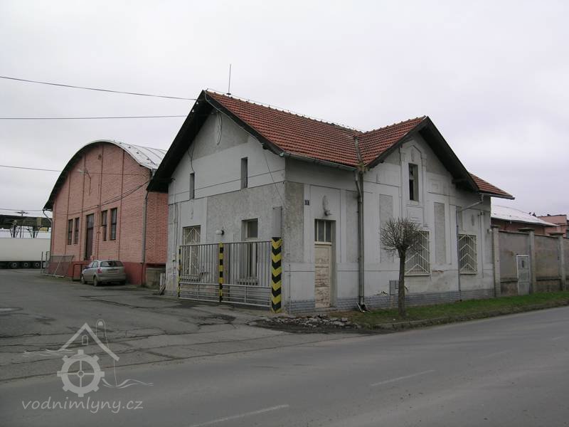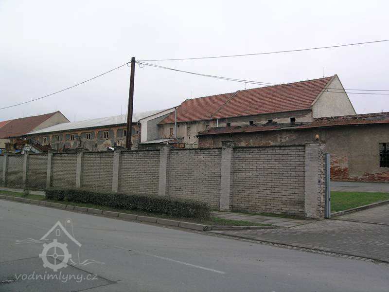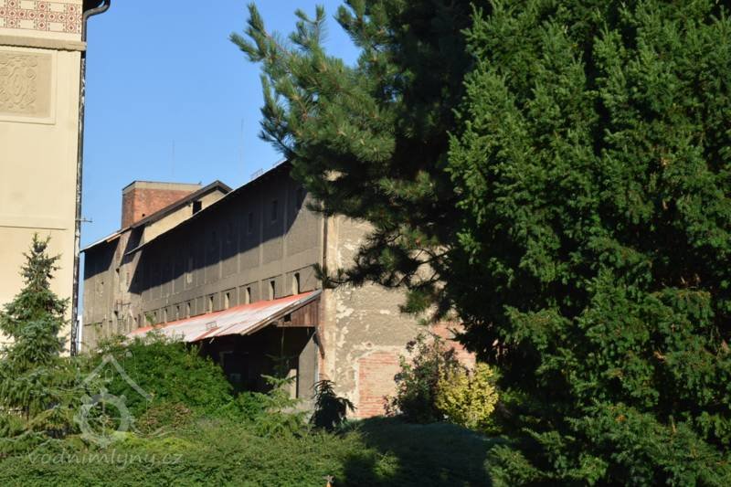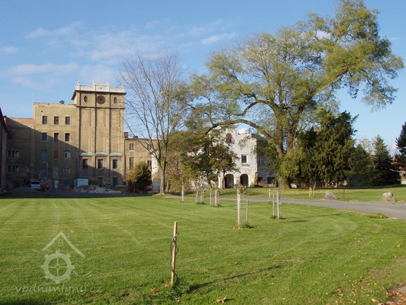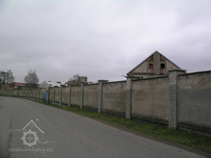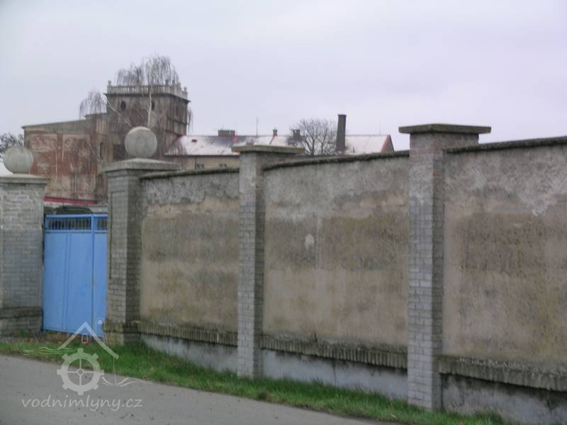Vjezd do areálu a mlýn v pozadí, červenec 2016, © viz mapy.cz