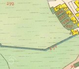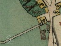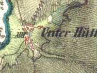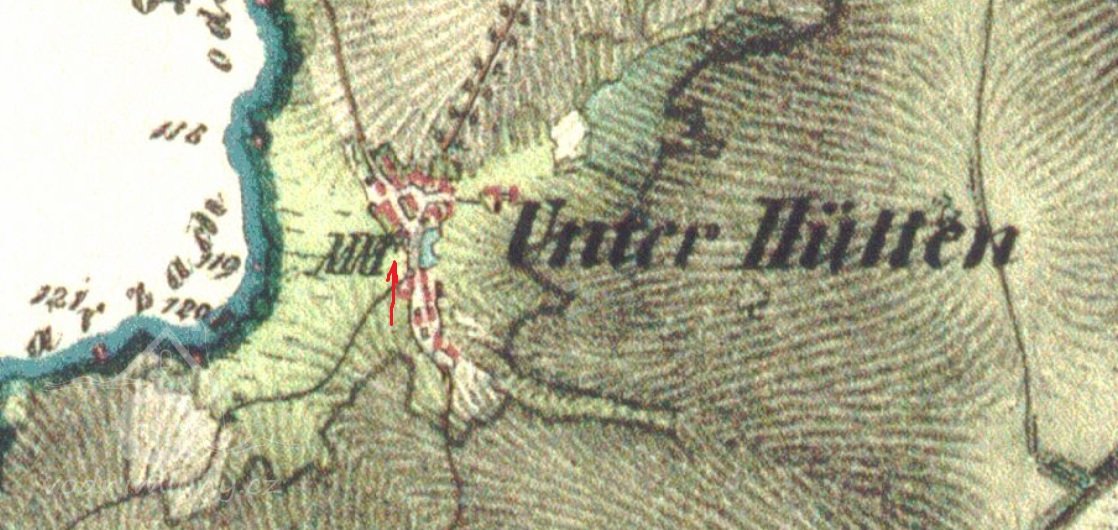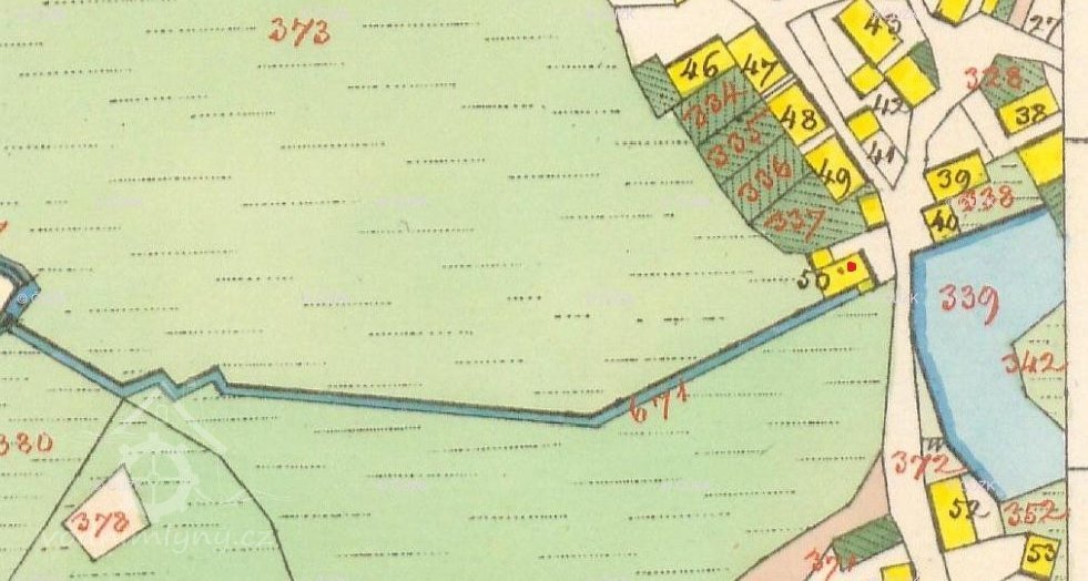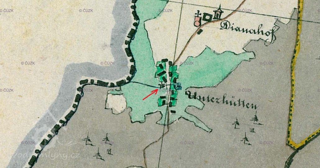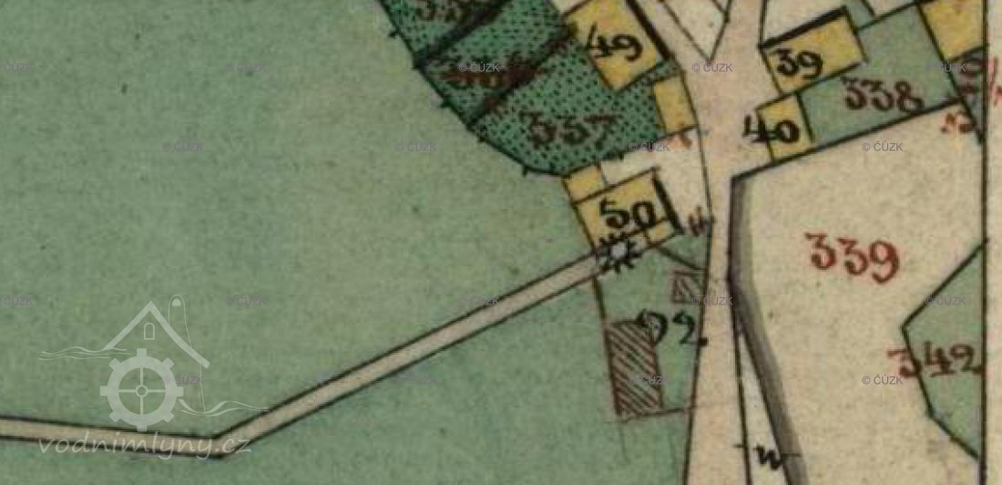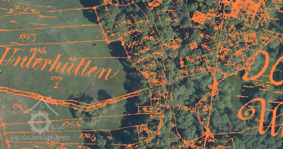 Otisk, skica i originální mapa stabilního katastru v roce 1838 – zakreslený náhon, spalná budova s jedním kolem, za mlýnem rybník, majitelem mlýna je Franz Hegerl.