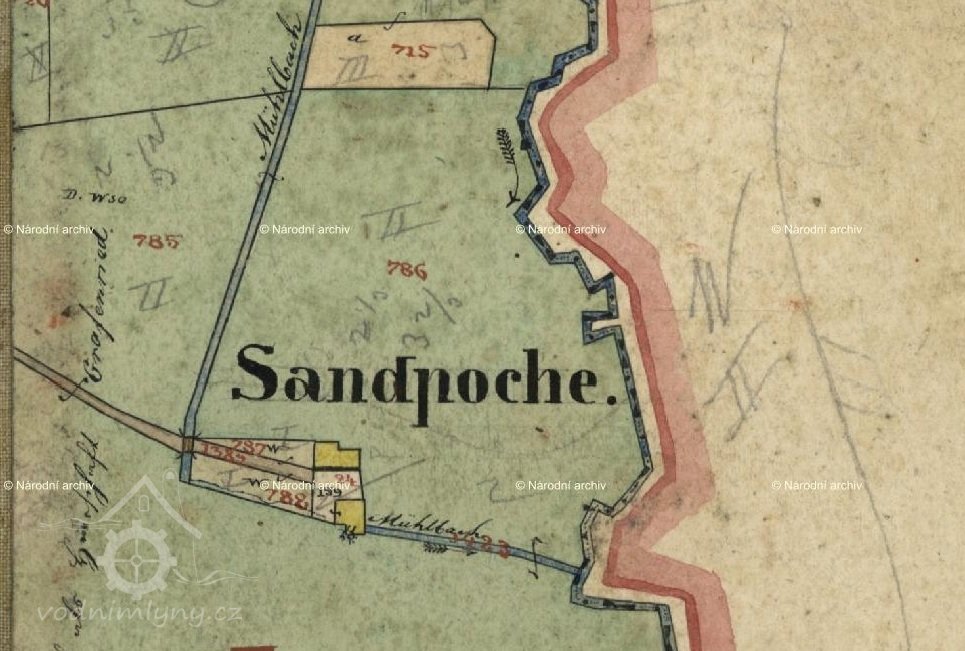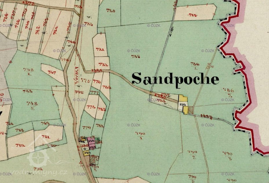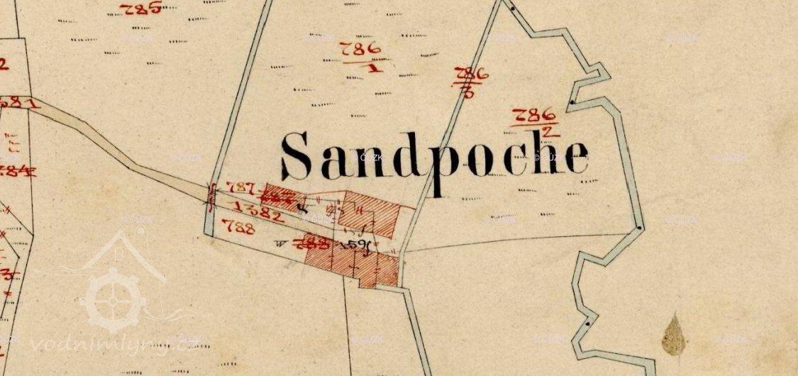 Stabilní katastr v roce 1838 zaznamenává severně nad obcí dvě samostatné dřevěné budovy, dvě kola, náhon.