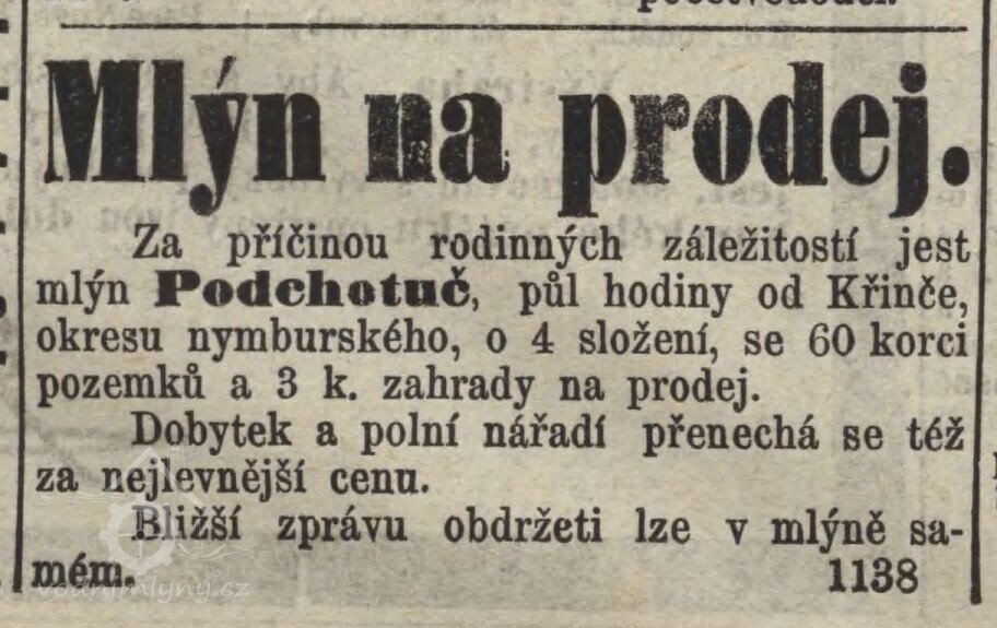 V roce 1775 … byl povolán ku ouřadu křineckému mlynář Josef Miklic a bylo mu předneseno, že se rybník Podchotucký na 3 léta spustí a bude osívat, aby se řádně od porostu rákosového a bláta vyčistiti mohl, které se bude vyvážet na sousední panská pole. Poněvadž nájmu a dávky obilí spokojiti se chce po čas, co nebude moci mleti na svém mlýně, který před dávnými léty byl zřízen. Mlynář se tím spokojil. Dnes se již nedozvíme, zda Miklic podcenil situaci, či neměl mnoho zkušeností s mlynářským řemeslem nebo byl vrchností prostě zbaven svého postavení. Po uplynutí doby čistění rybníka byl nucen majetek opustit a pak s manželkou Terezou a nevlastním synem Janem Horáčkem dožívali v čp. 98 v Křinci.