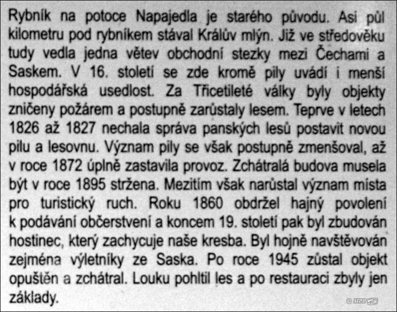 Pokud by se mlýn zachoval do dnešních dob,oslavovali bychom 431 let jeho existence.Doby a poměry se ale měnily a s ním i osud tohoto Královského mlýna.Zpočátku to byla pila poháněná vodním kolem,potom sídlo správce lesa a na počátku tohoto století oblíbená restaurace pro turisty,které sem dovedla modře značená stezka.