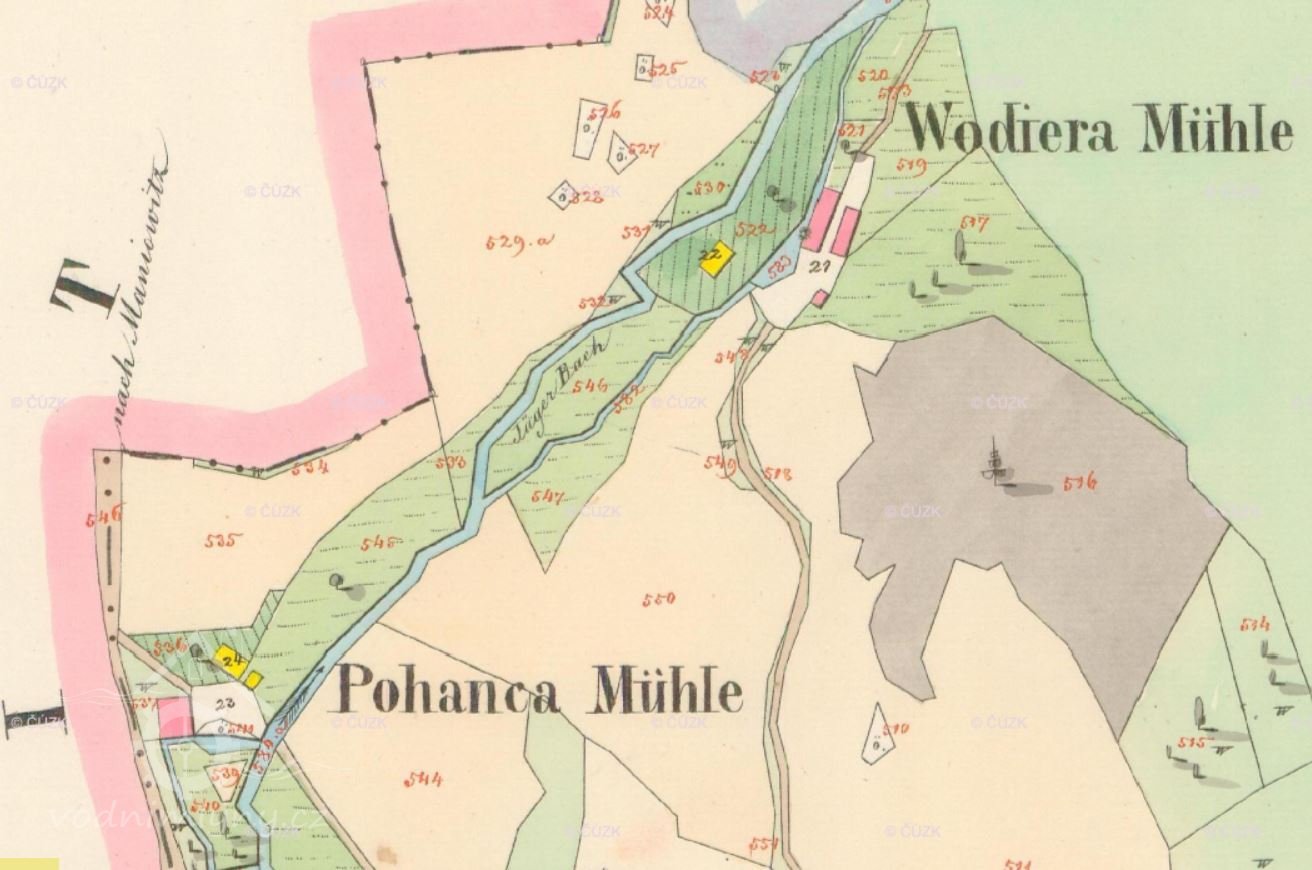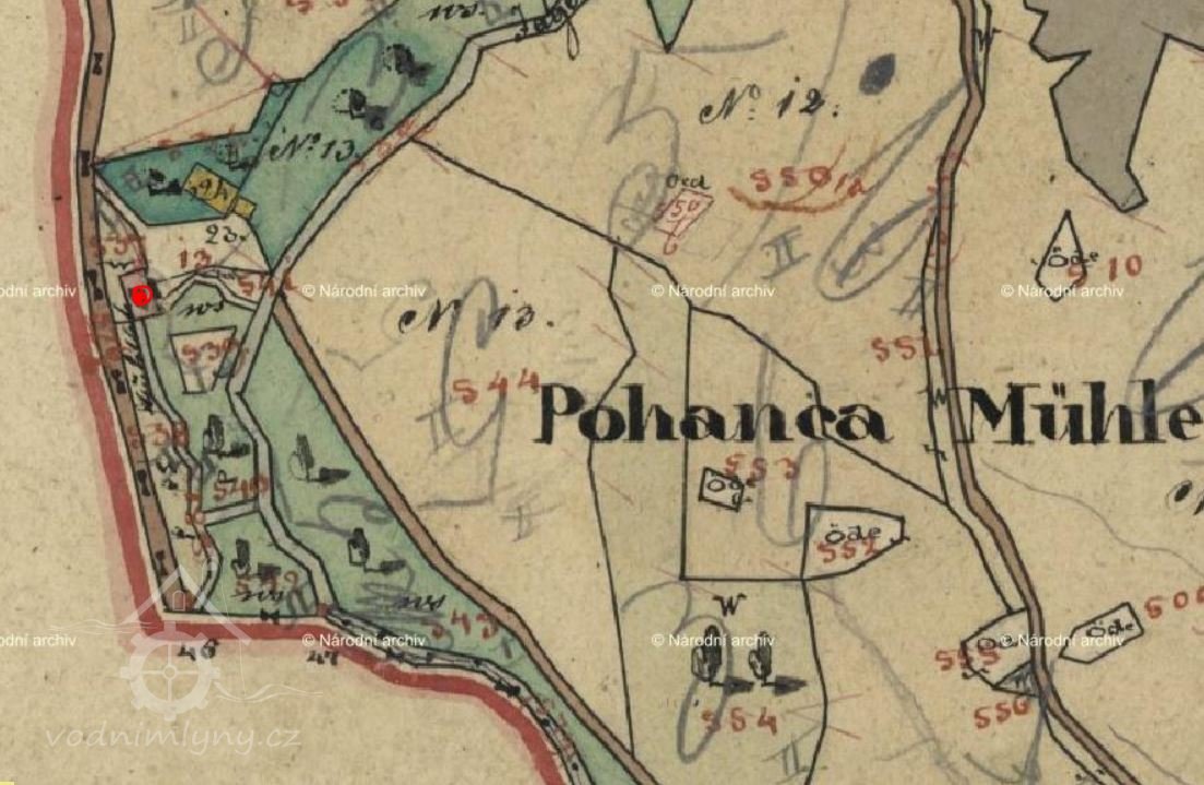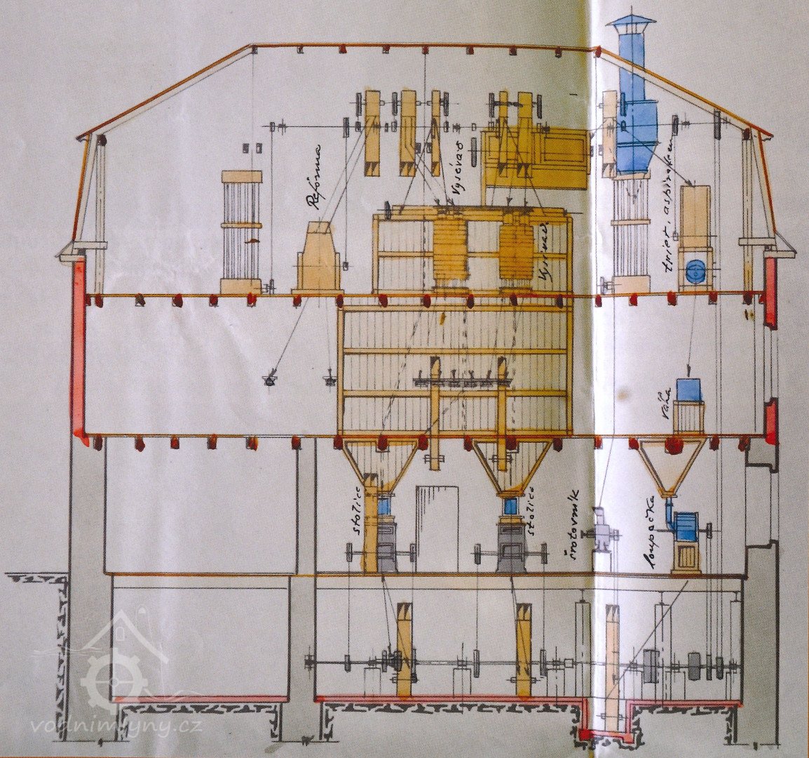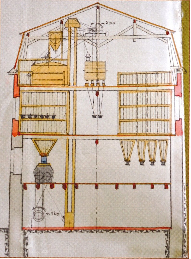 Popis1881 2 vodní kola, průměr 4,425 m, šířka 1,05 m, hloubka korečku 0,25 m, 3. kolo o prům. 4,43 pohánělo pilu