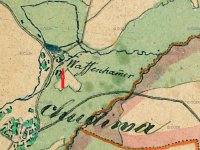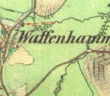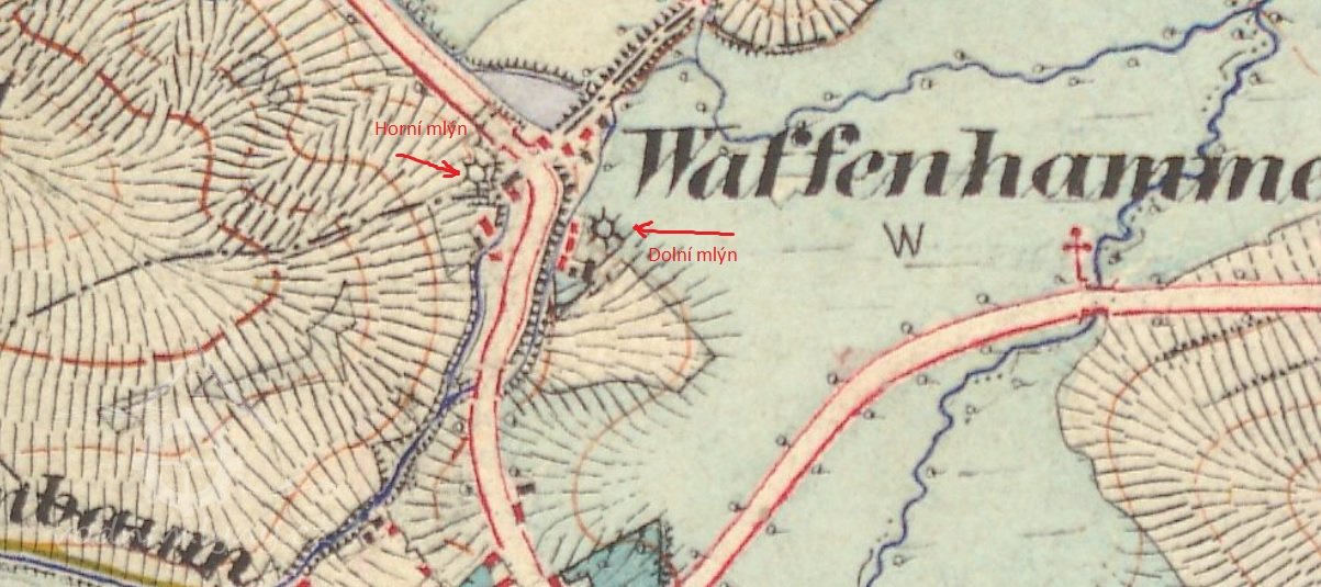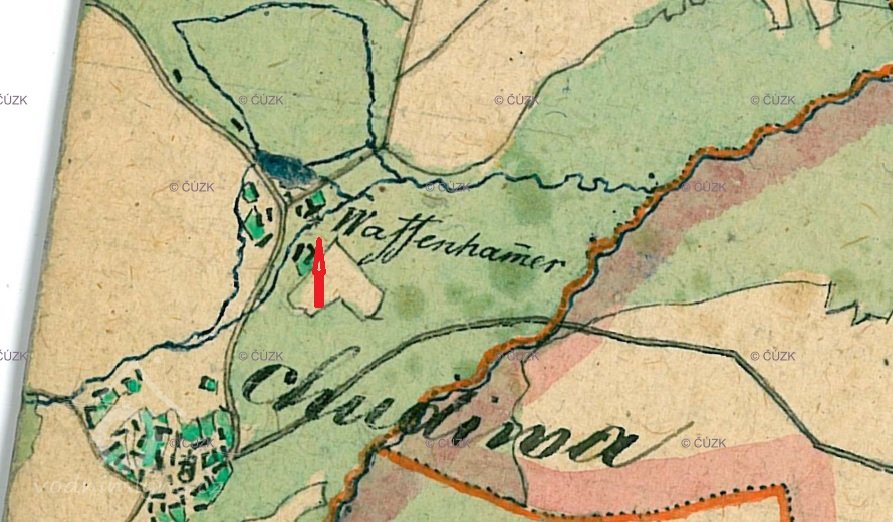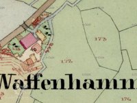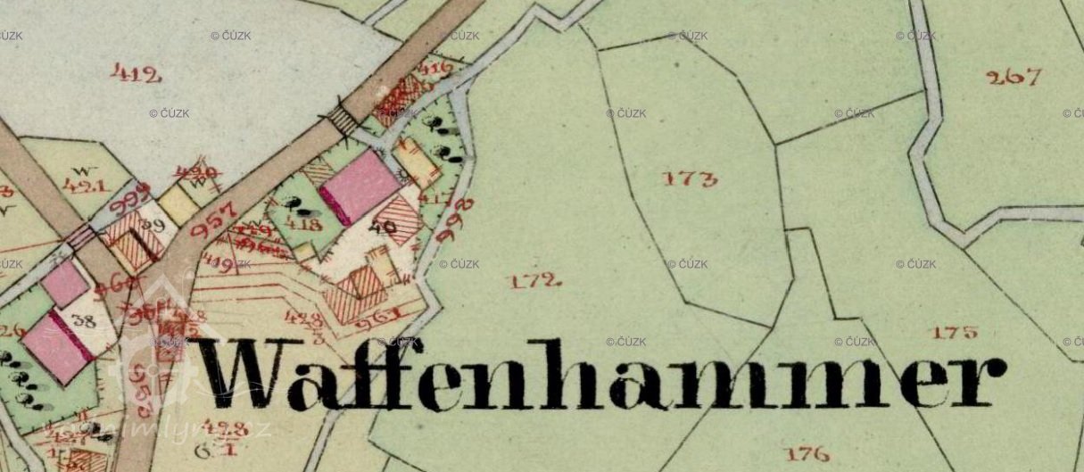 1838 – na originální mapě stabilního katastru je jedna obdélníková nespalná budova s jedním kolem a jedna spalná obdélníková budova s jedním kolem, majitelem Andreas Beil, označeno názvem Waffenhammer.