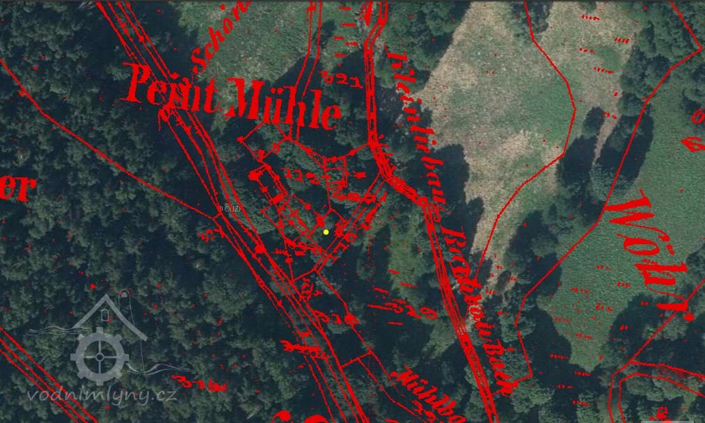 Mlýn položený 100 m pod stejnojmenný mlýnem, ovšem na jiném katastru, doložený již k roku 1572, zanikl po roce 1945 při zřízení VVT Prameny.