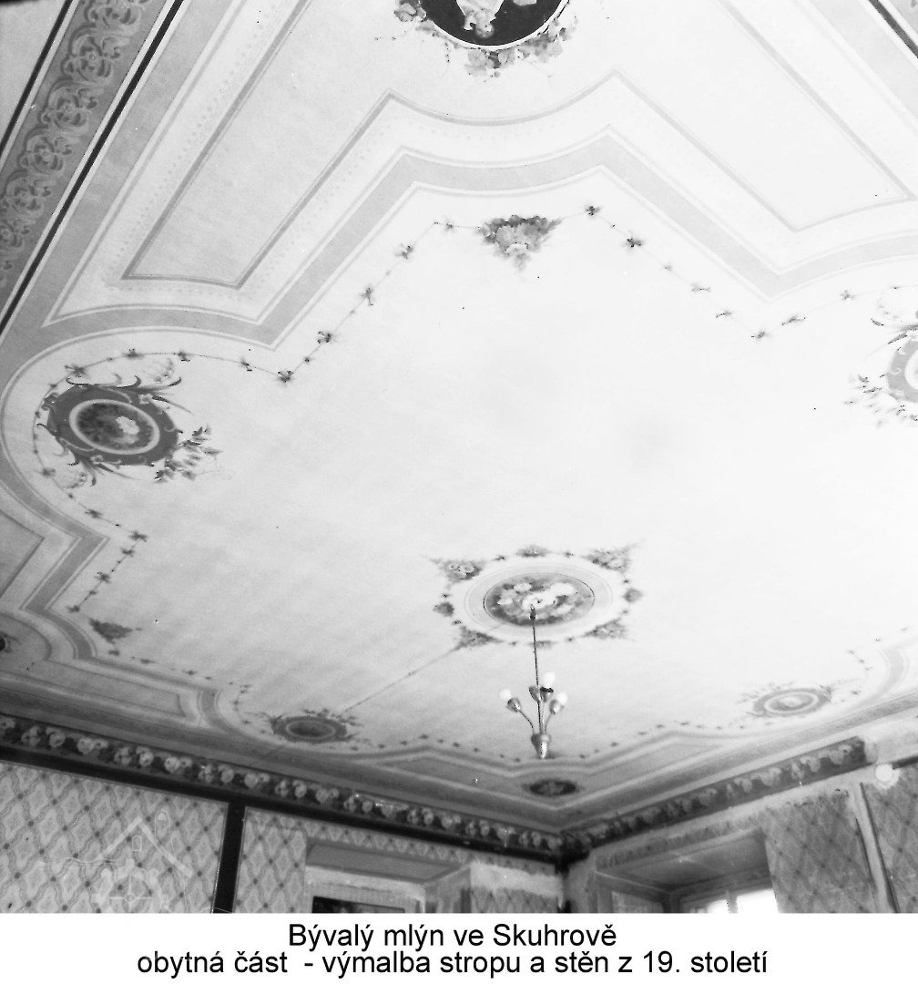V roce 1729 koupil ves Skuhrov rytíř Jan František Turba ( 1685 – 1760 ), doktor práv, dvorní rada, rada komorního soudu a české dvorské kanceláře. Horní mlýn v té době držel Jan Klaban. Před objektem mlýna stojí kamenná socha sv. Jana Nepomuckého, kterou do Skuhrova opatřil rytíř Turba v roce 1730. Součástí mlýna byl malý třípodlažní zámeček, který 1823 i s mlýnem vyhořel. Vzápětí byl mlýn i zámeček obnoven, ale již jen o dvou podlažích. V 19. století byl zámeček upraven na byty majitele a zaměstnanců. Stěny a stropy obytných místností v 1. patře byly vymalovány v romantickém dekorativním stylu biedermayeru, ozdobné medailony s květinovými motivy údajně maloval Josef Navrátil. Výmalba se zachovala až do 70. let 20. století, kdy byly prostory změněny na výrobu kožedělného zboží podniku Kozak Dolní Beřkovice. Malby byly seškrábány nebo zabíleny.