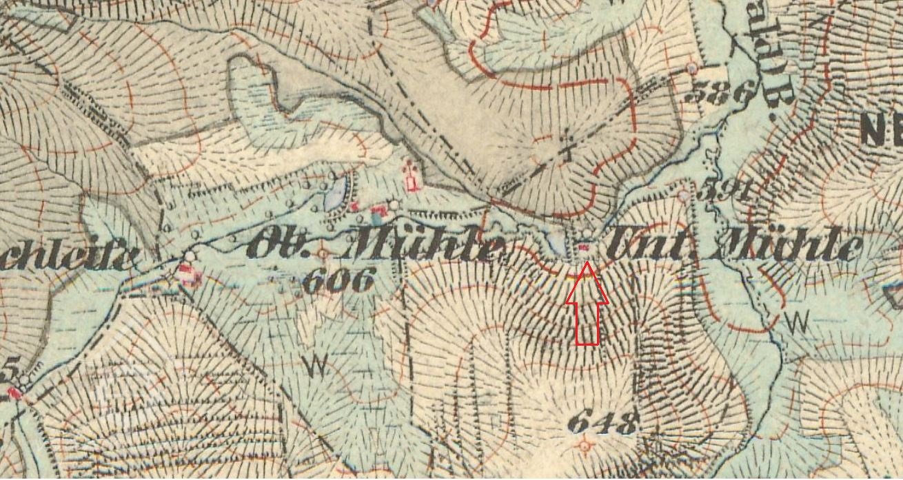 Dle sčítání obyvatel z roku 1869 zde tehdy byl mlynář Wenzl Träger (narozen 1801) a manželkou Marií (1803). S nimi zde žilo jejich 5 synů a 1 dcera. Živý inventář obsahoval 2 krávy, 2 voli, 2 telata a 2 vepře.