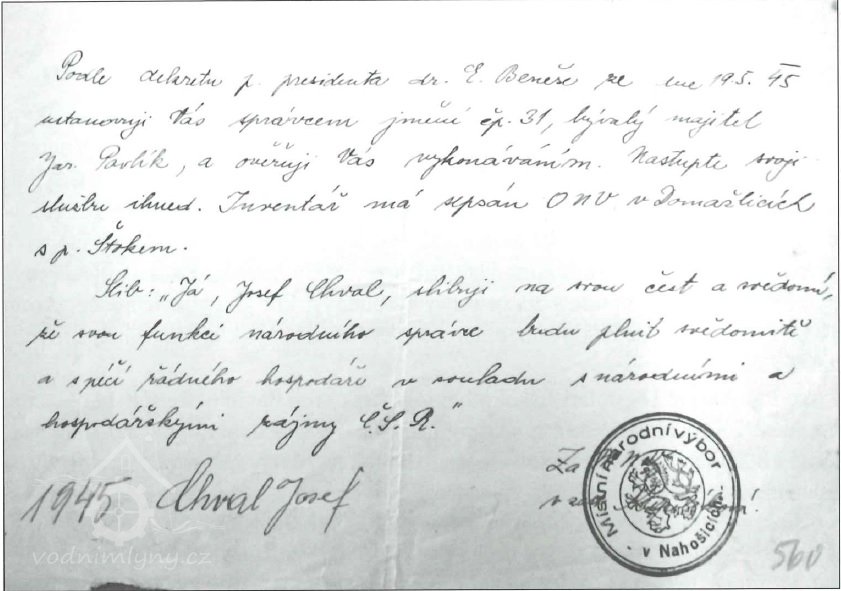 V roce 1945 byl sepsán seznam vybavení mlýna: stroj na čištění krupice ( reforma ), moučné cylindry, 3 výtahy a třídící vysévače, kámen – šrotovník, loupačka a 2 válcové stolice na žito, francouzský kámen, porcelánová stolice, koukolník ( triér ), prašný cylindr, 3 decimální váhy atd. Mlýn měl tehdy 2 kola na svrchní vodu o průměru 3,30 m a šíře 92 cm, která poháněla 3 stolice a 1 šrotovník. Třetí kolo bylo určeno pro pohon pily. Na mlýn byl usazen nový národní správce, který se však obecnímu zastupitelstvu nelíbil. Po četných sporech byl mlýn přidělen mlynáři Josefu Chvalovi ze Strýčkovic.