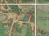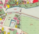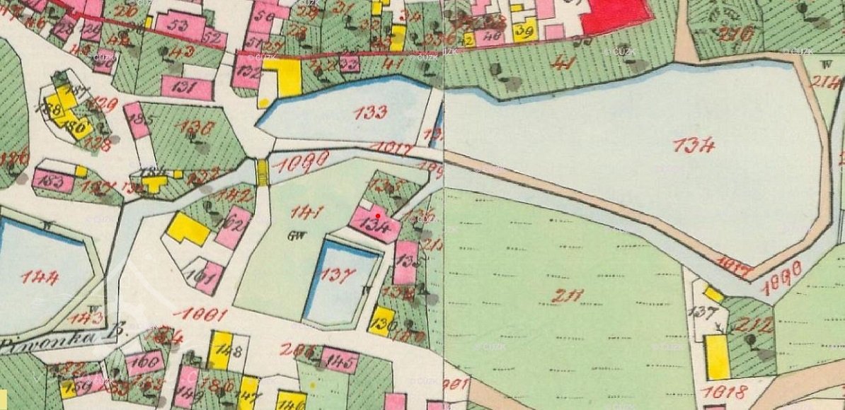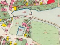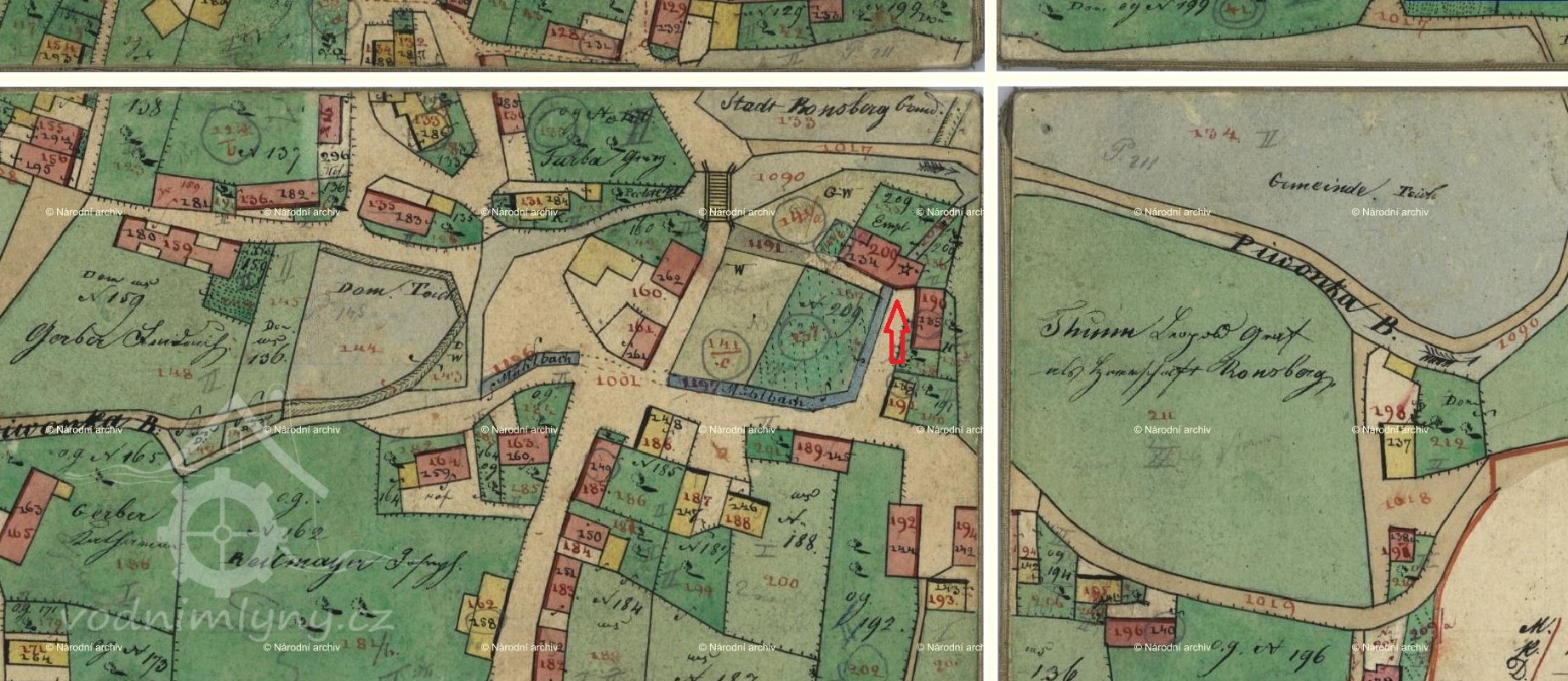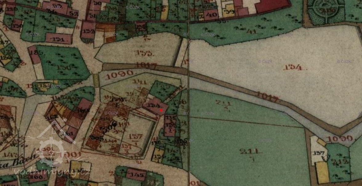 Indikační skica z roku 1838 - náhon z Pivoňky, větší nespalná budova, náhon vedl budovou, jedno kolo, za mlýnem se náhon opět spojuje s Pivoňkou. Originální mapa a otisk nejsou v místě publikovány. J. G. Sommer zmiňuje v Poběžovicích k roku 1839 mj. panský pivovar na 20 sudů, lihovar, papírnu, kovárnu, 3 mlýny a 2 mlýny na kroupy.